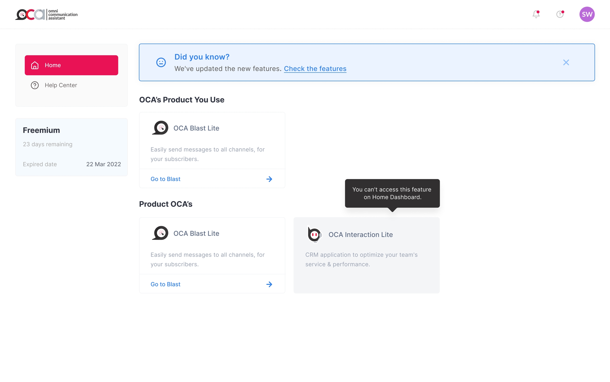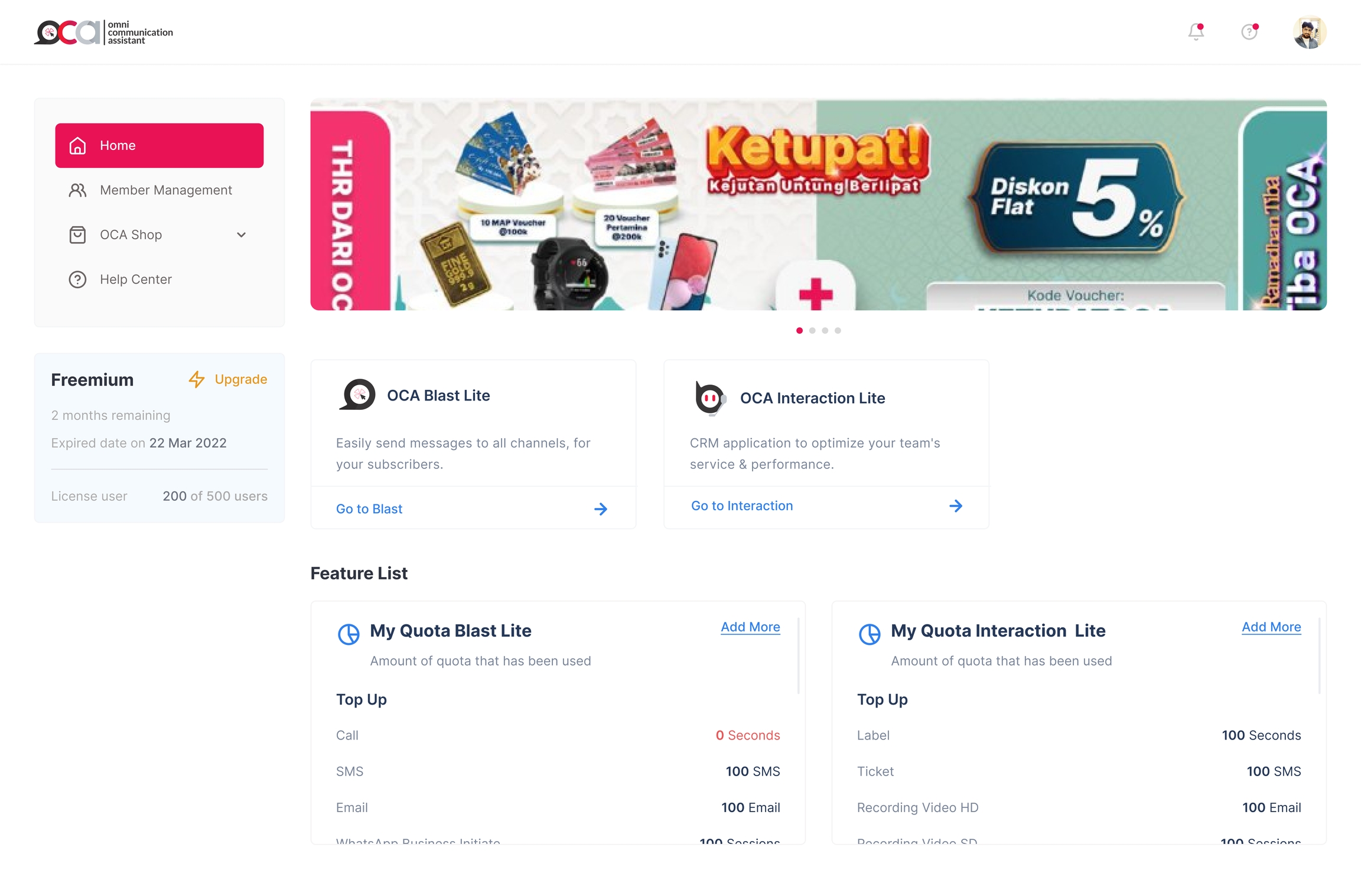 Tidak hanya itu, untuk pemilik akun Member dapat melakukan task cross-platform OCA, melalui satu portal atau satu Dashboard, yakni Home Dashboard. Melalui Home Dashboard juga, para owner/parent account dapat melakukan monitoring terhadap remaining quota dari setiap masing-masing product yang sudah dimiliki.