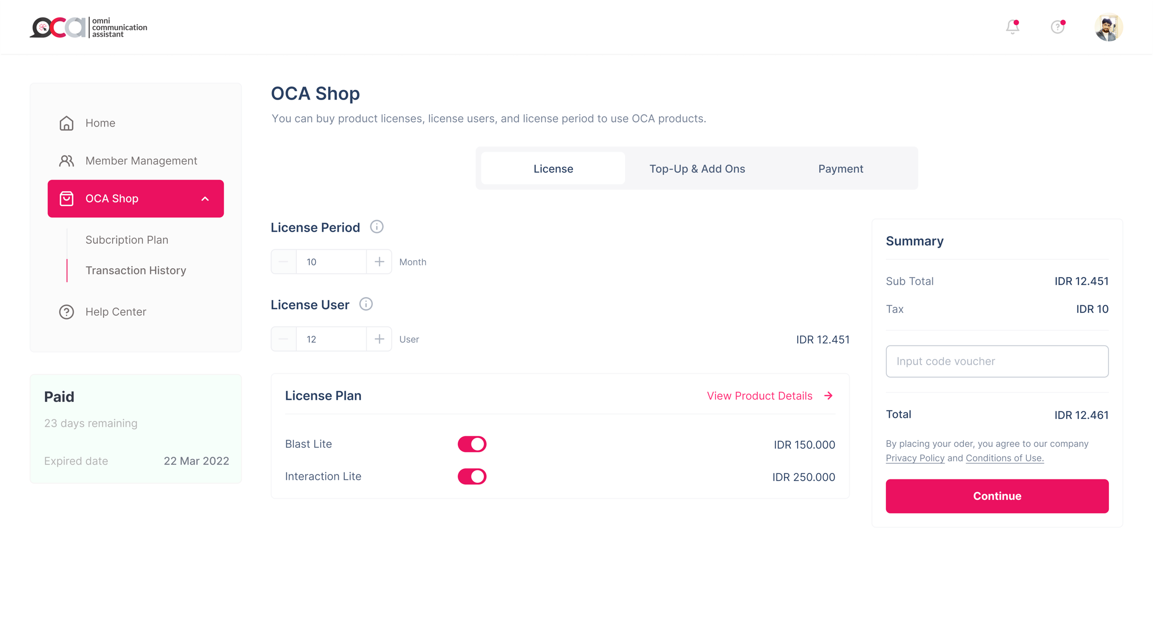 Let's say you want to sign up for OCA Indonesia for four months, use the OCA Blast and OCA Interaction products, and have two members who will become agents in OCA Interaction. To do this, you must purchase the OCA Blast license for 999k/month and the OCA Interaction license for 250k/month, while the cost for members is 99k/member/month.