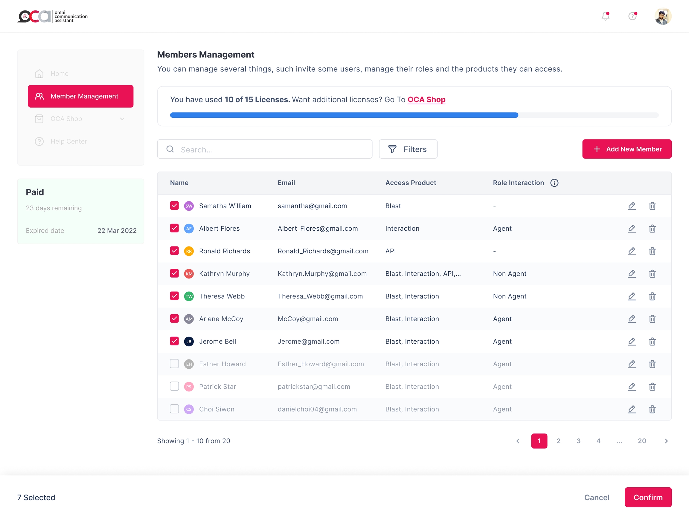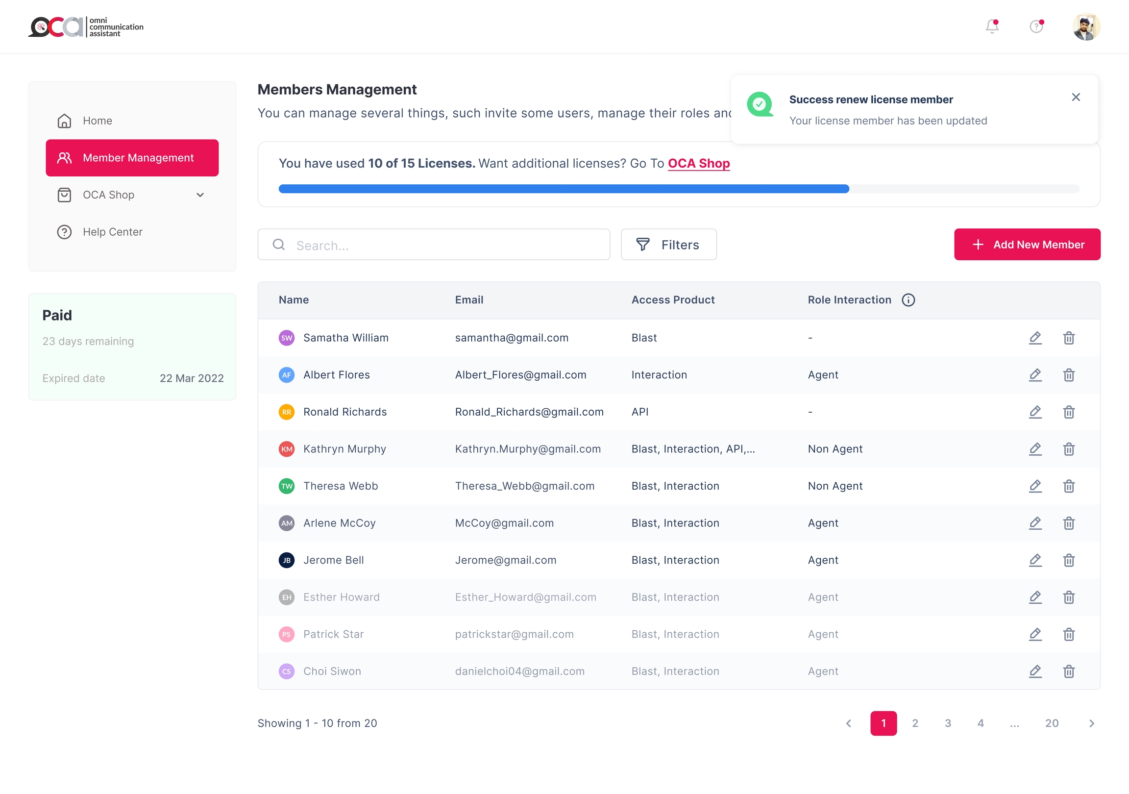 Jika Anda sudah menyelesaikan pembayaran hingga pembayarannya terverifikasi, Anda akan secara otomatis diarahkan dan masuk ke menu Member Management. Pada fase ini, semua fitur akan kami nonaktifkan sampai Anda selesai memilih member yang akan diberikan license.