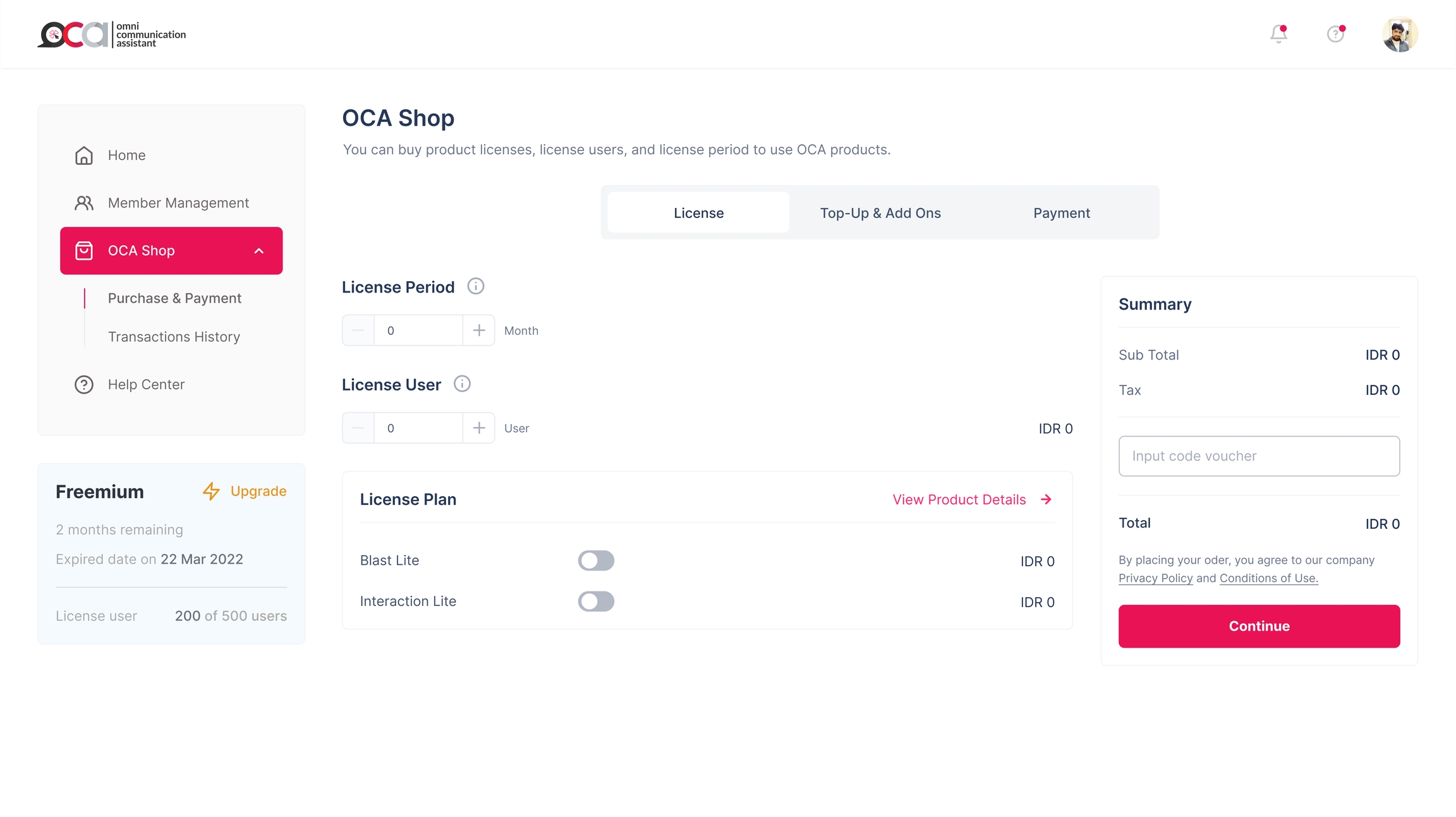 Melalui OCA Shop, Anda dapat berlangganan license untuk menggunakan produk-produk OCA. Menu OCA Shop terdiri dari dua bagian, pertama ada Purchase & Payment, yang berfungsi untuk membeli tambahan license dan quota.