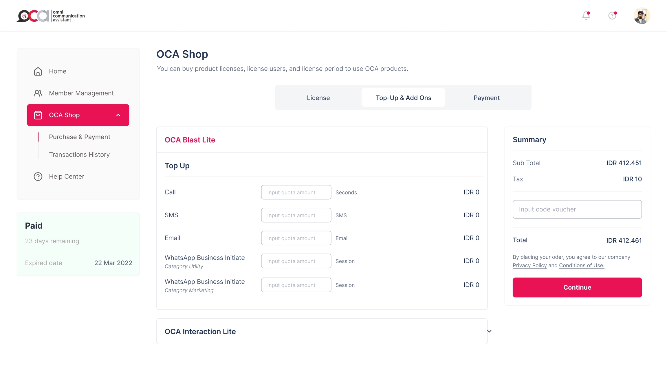 Selanjutnya ada kolom Top-up, yang mana kolom ini akan berisi tentang kebutuhan-kebutuhan untuk produk OCA Blast. Anda dapat menyesuaikan kebutuhan blasting Anda.