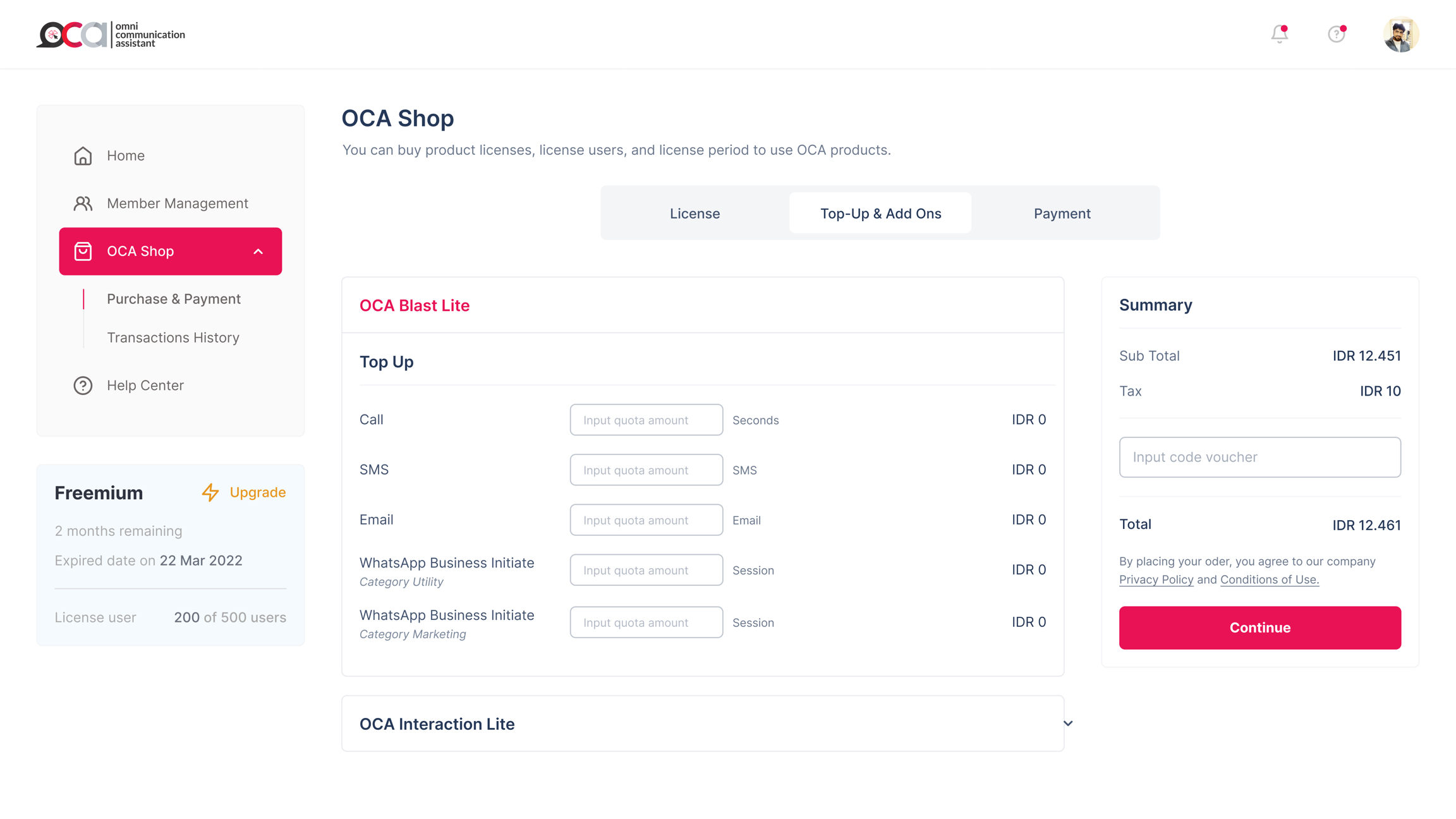 Misalnya Anda ingin berlangganan di OCA Indonesia selama empat bulan, dengan produk yang ingin digunakan OCA Blast dan OCA Interaction, diikuti dengan dua member yang akan dijadikan Agent di produk OCA Interaction—Anda harus mengambil license OCA Blast seharga 999k/bulan, dan OCA Interaction seharga 250k/bulan, sedangkan untuk membernya seharga 99k/member/bulan.