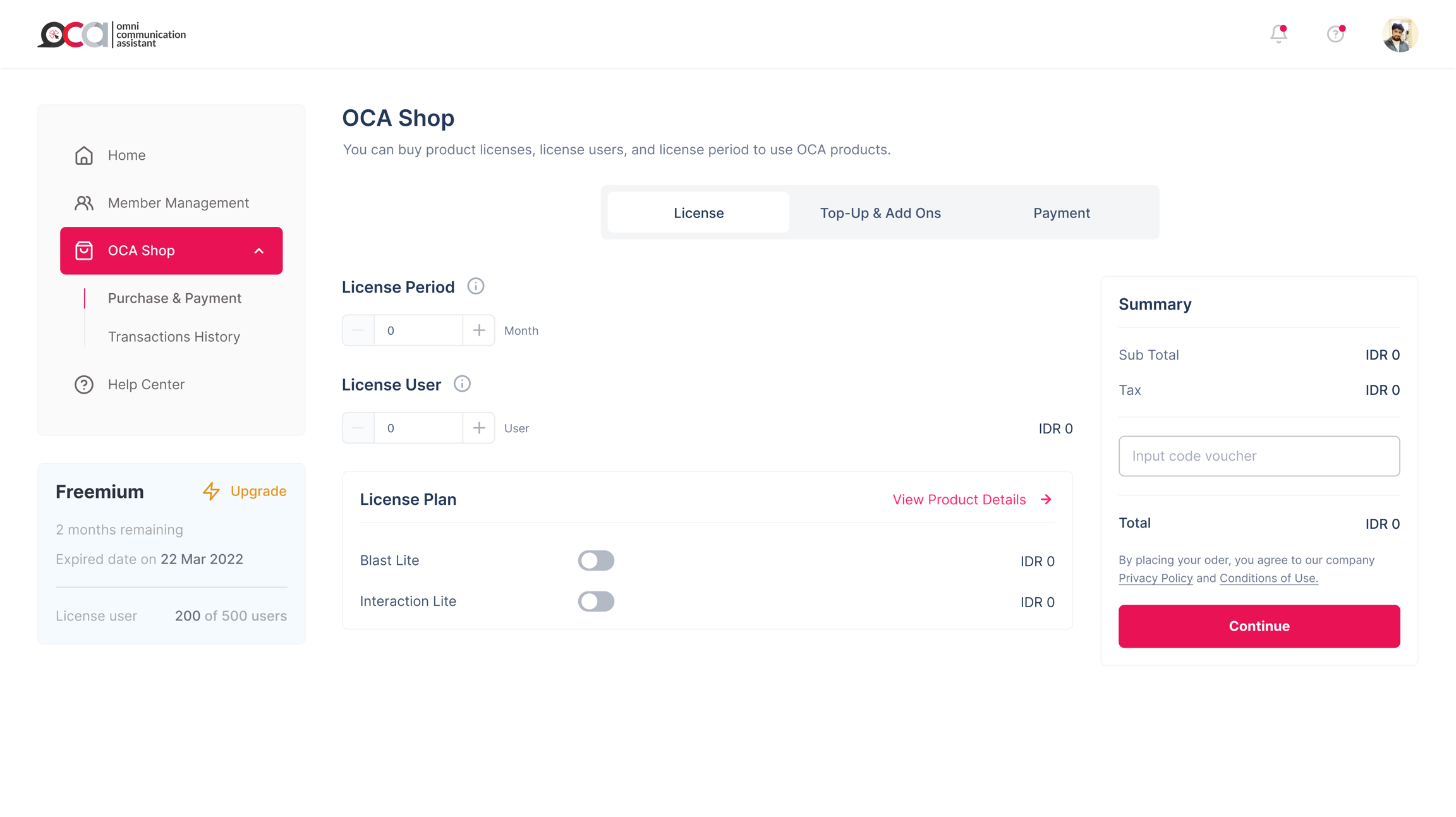 Melalui laman Purchase & Payment, Anda akan dipertemukan dengan tiga kolom yang terdiri dari; License, Top-up, serta Payment.