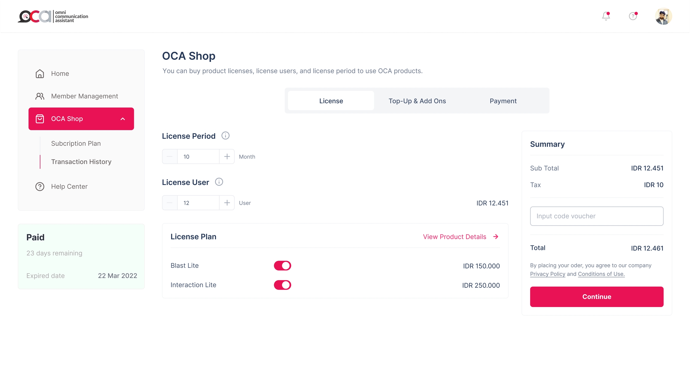 Perhitungan total = (Sub total (License User + Product + Top Up and Add Ons) - Diskon Voucher) + Pajak 11%.