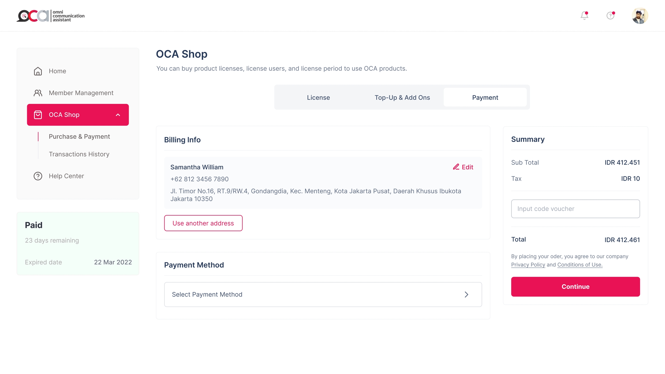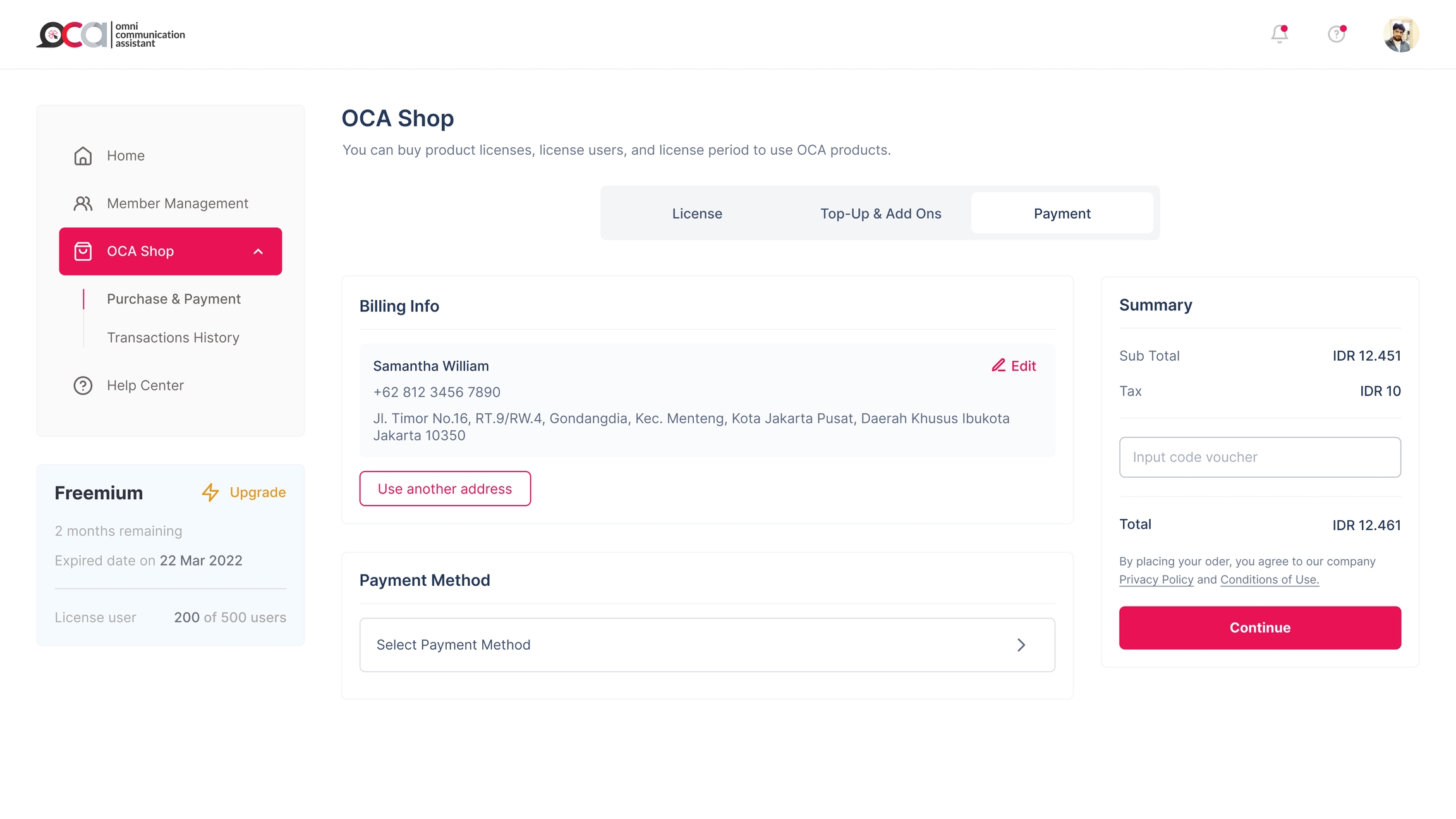 Terakhir ada kolom Payment, yang mana kolom ini berisi Billing Address & Payment. Billing Address dapat Anda isi alamat penagihan, dan Payment merupakan jenis pembayaran yang akan Anda gunakan, ketika Anda sudah melakukan kustomisasi kebutuhan di kolom License dan Top-up.