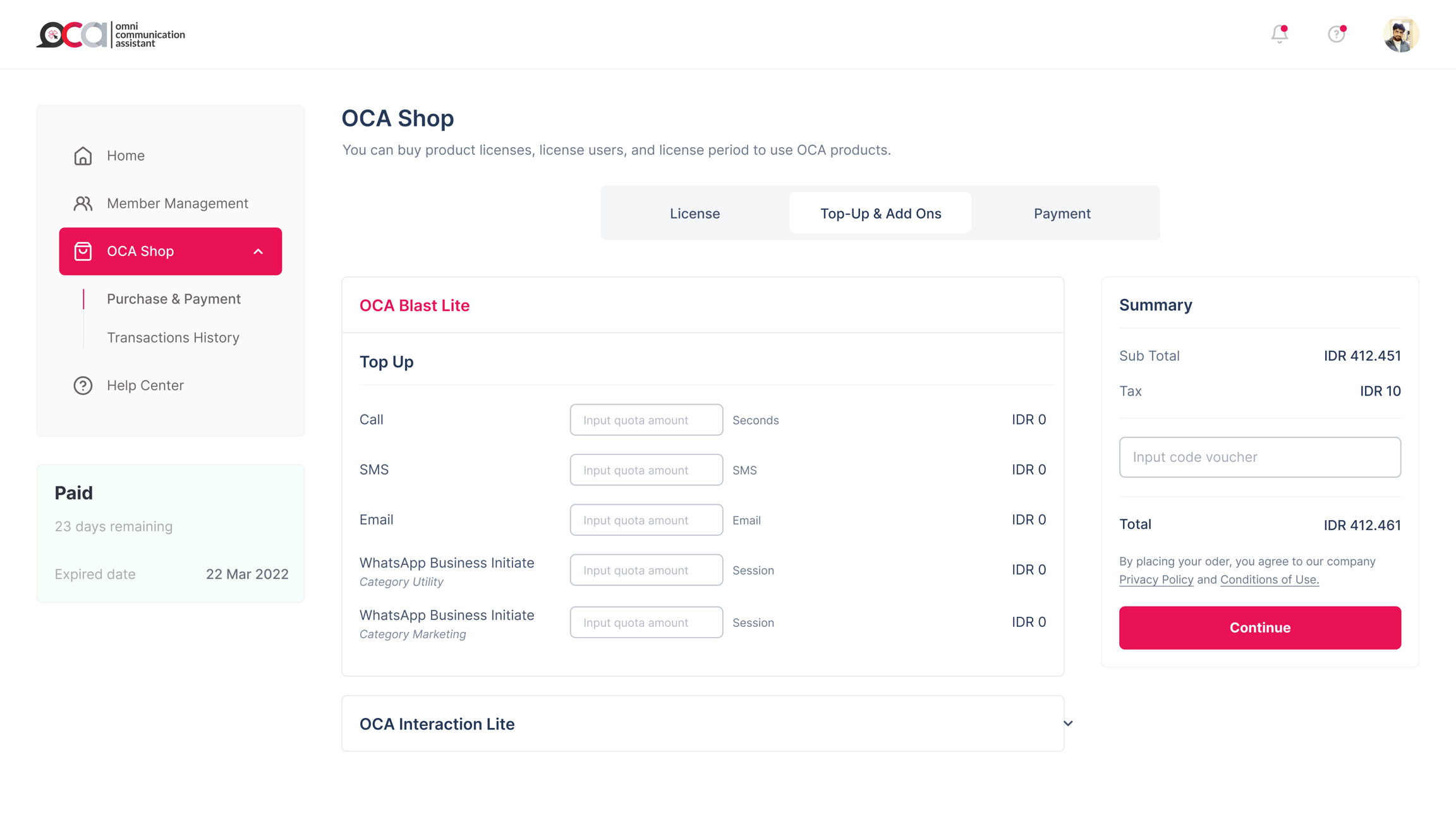 Misalnya Anda ingin berlangganan di OCA Indonesia selama empat bulan, dengan produk yang ingin digunakan OCA Blast dan OCA Interaction, diikuti dengan dua member yang akan dijadikan Agent di produk OCA Interaction—Anda harus mengambil license OCA Blast seharga 999k/bulan, dan OCA Interaction seharga 250k/bulan, sedangkan untuk membernya seharga 99k/member/bulan.