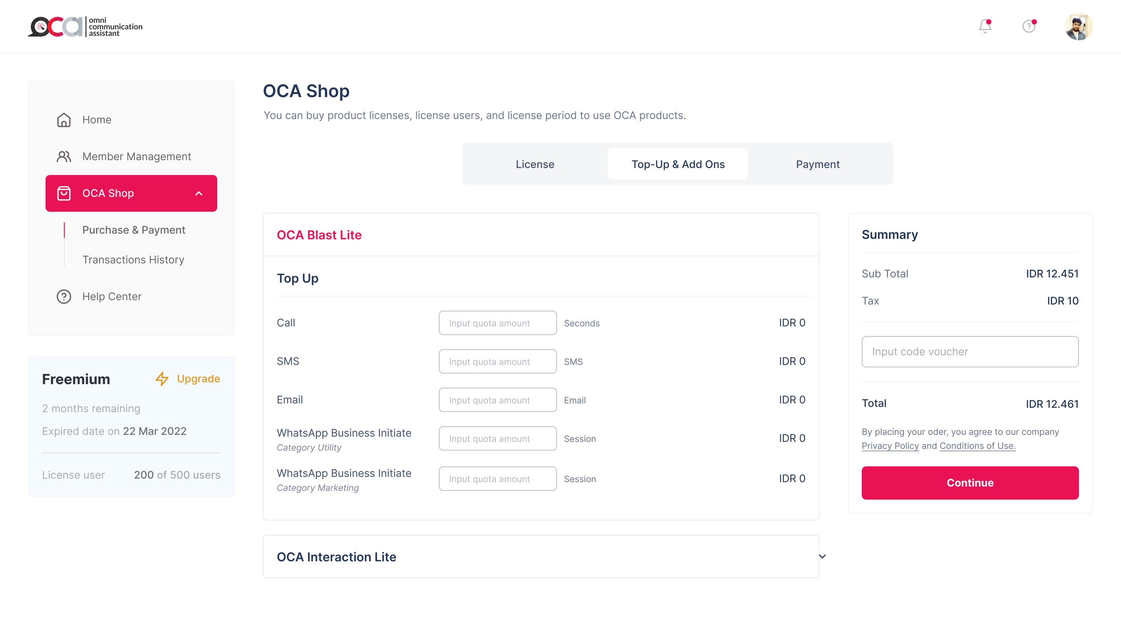 Selanjutnya ada kolom Top-up, yang mana kolom ini akan berisi tentang kebutuhan-kebutuhan untuk produk OCA Blast. Anda dapat menyesuaikan kebutuhan blasting Anda.