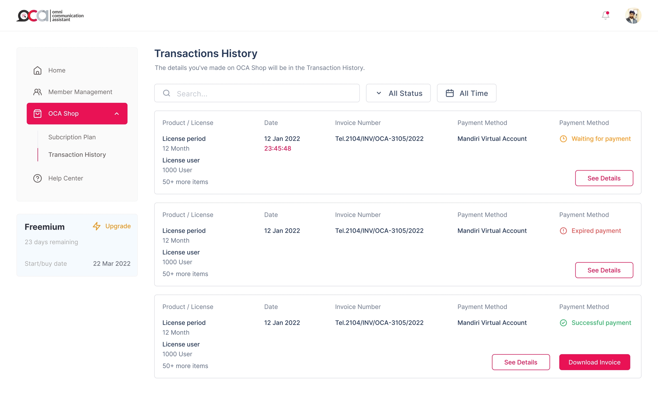 Anda dapat melihat detil aktivitas pembayaran/pembelian yang sudah Anda lakukan di OCA Shop, dengan cara menekan tombol See Details. Atau, jika Anda ingin mengunggah aktivitas pembayaran/pembelian, Anda dapat menekan tombol Download Invoice.