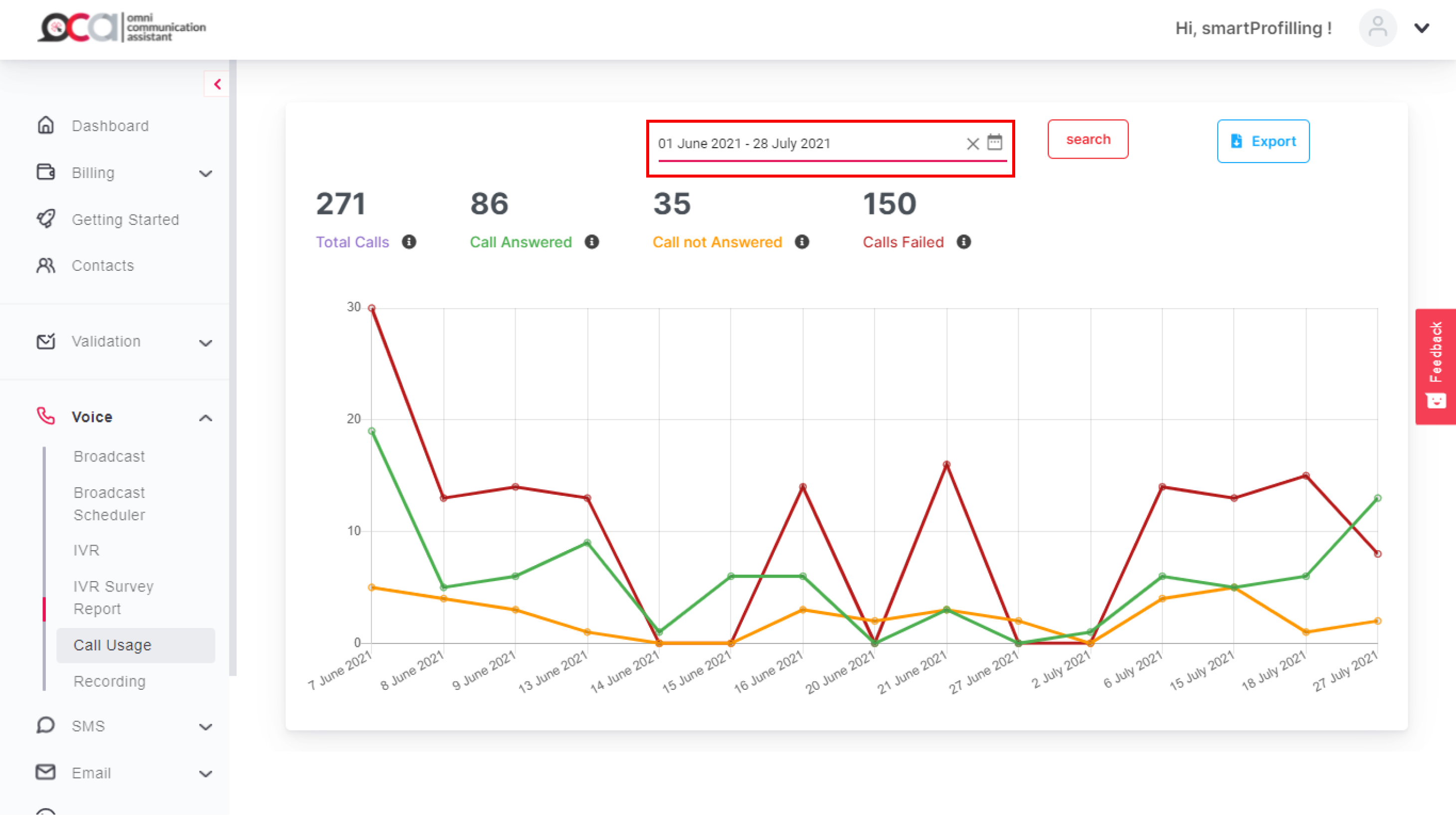 The system will automatically calculate the number of IVR calls that were Answered, RNA (Ringing Not Answered), or Failed. You can download this data in .xlsx format using the **Export** button in the top right corner.