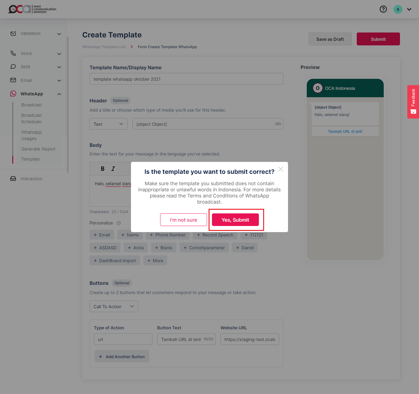 Once you have corrected the WhatsApp template you want to share, a message will appear confirming your action. If correct, you can immediately press the "Yes, Submit" button.