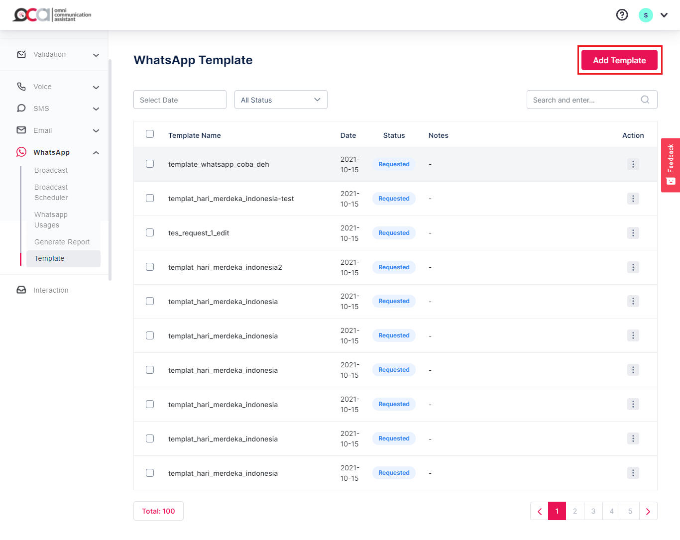 For those who recently used WhatsApp Broadcast, this page will be empty. To proceed, create a WhatsApp Template by selecting the "Add Template" button.