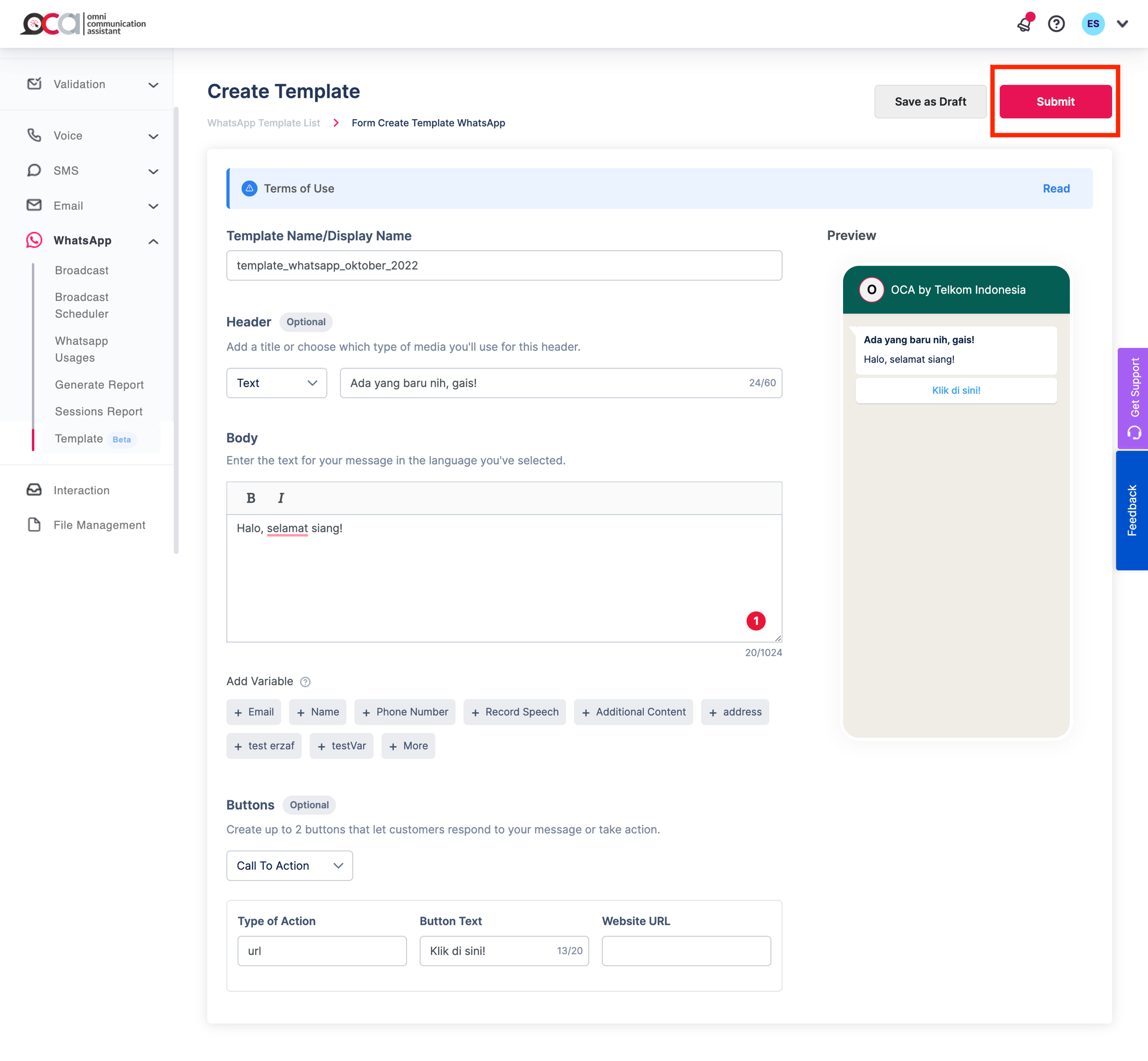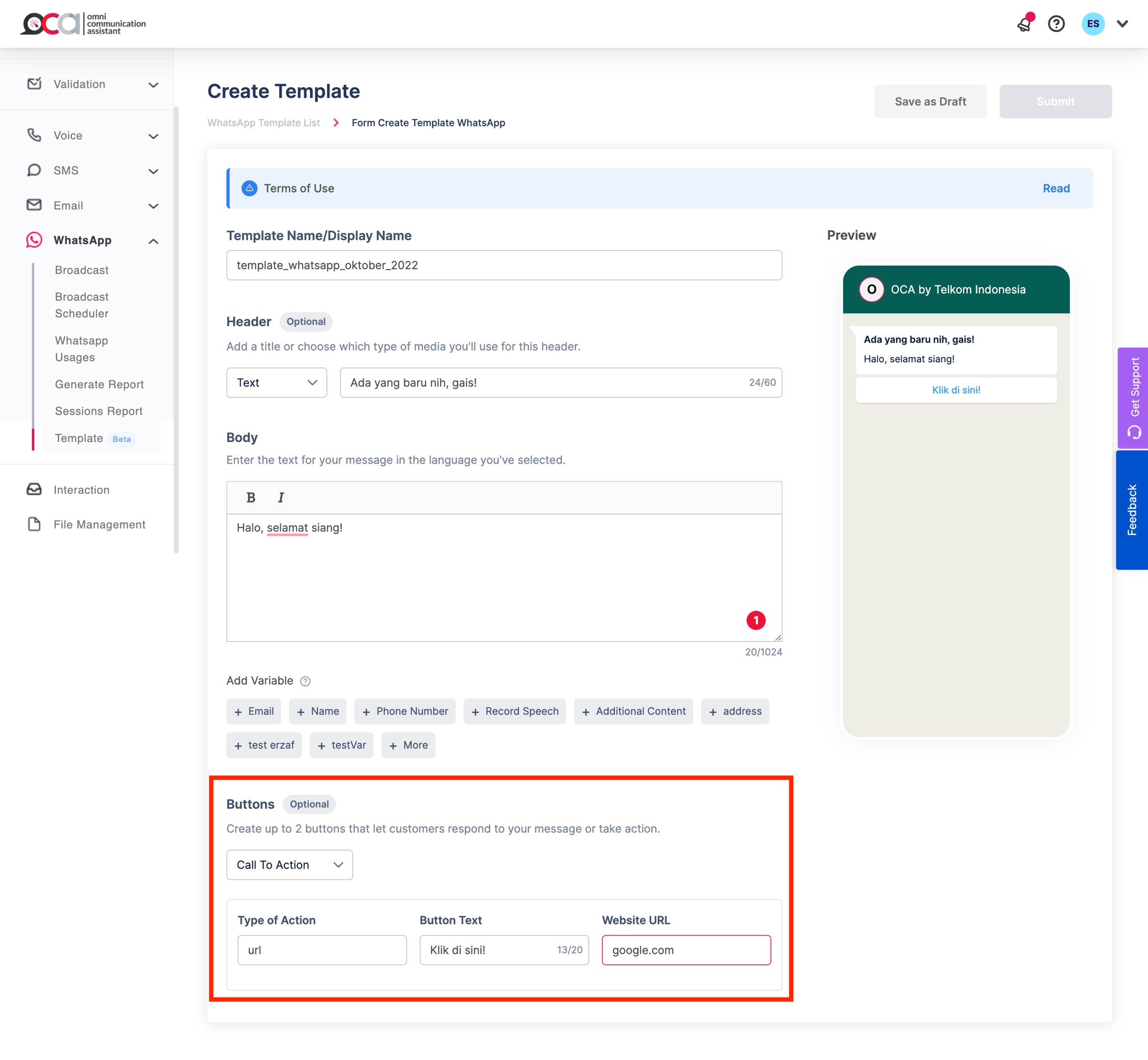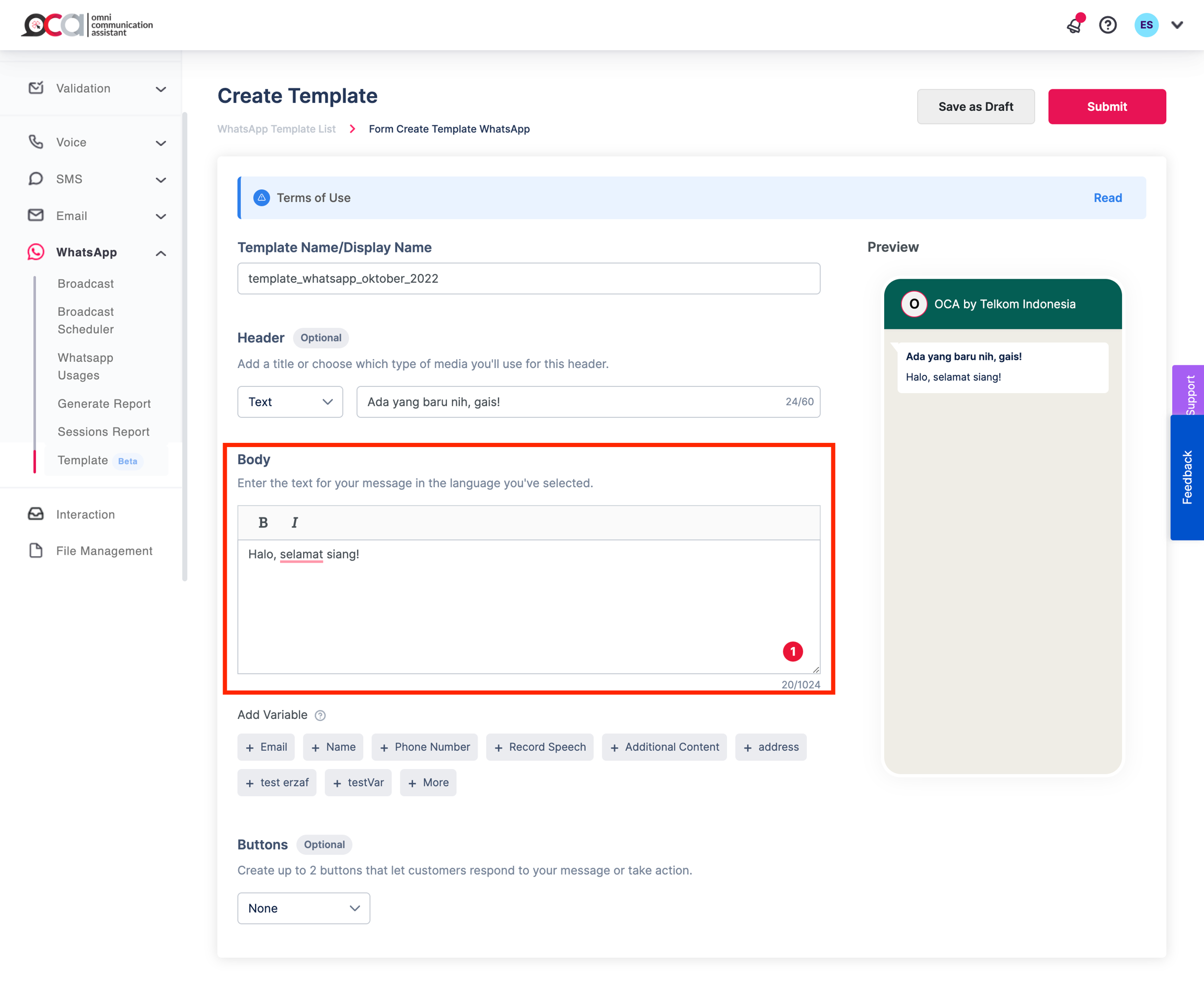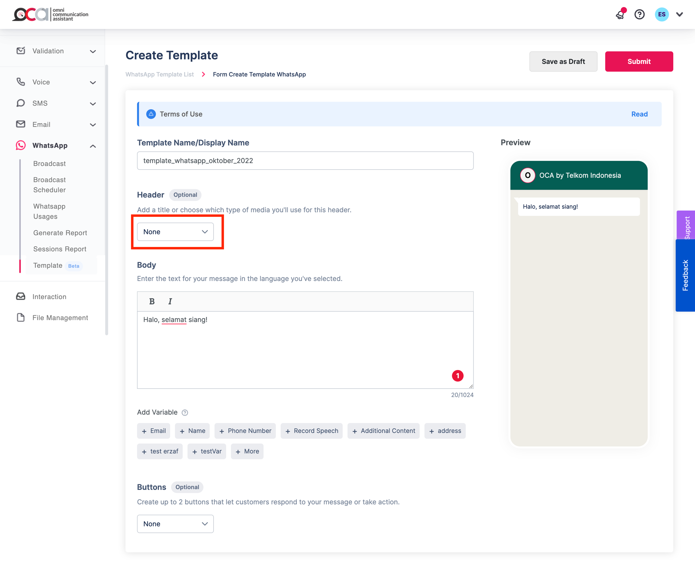 After that, you will be taken to the Create Template page, where you can make the WhatsApp Template you will use. You can create various templates and label them in the Template Name/Display Name fields. Additionally, in the Header column, you have three options: None, Media, or Text.