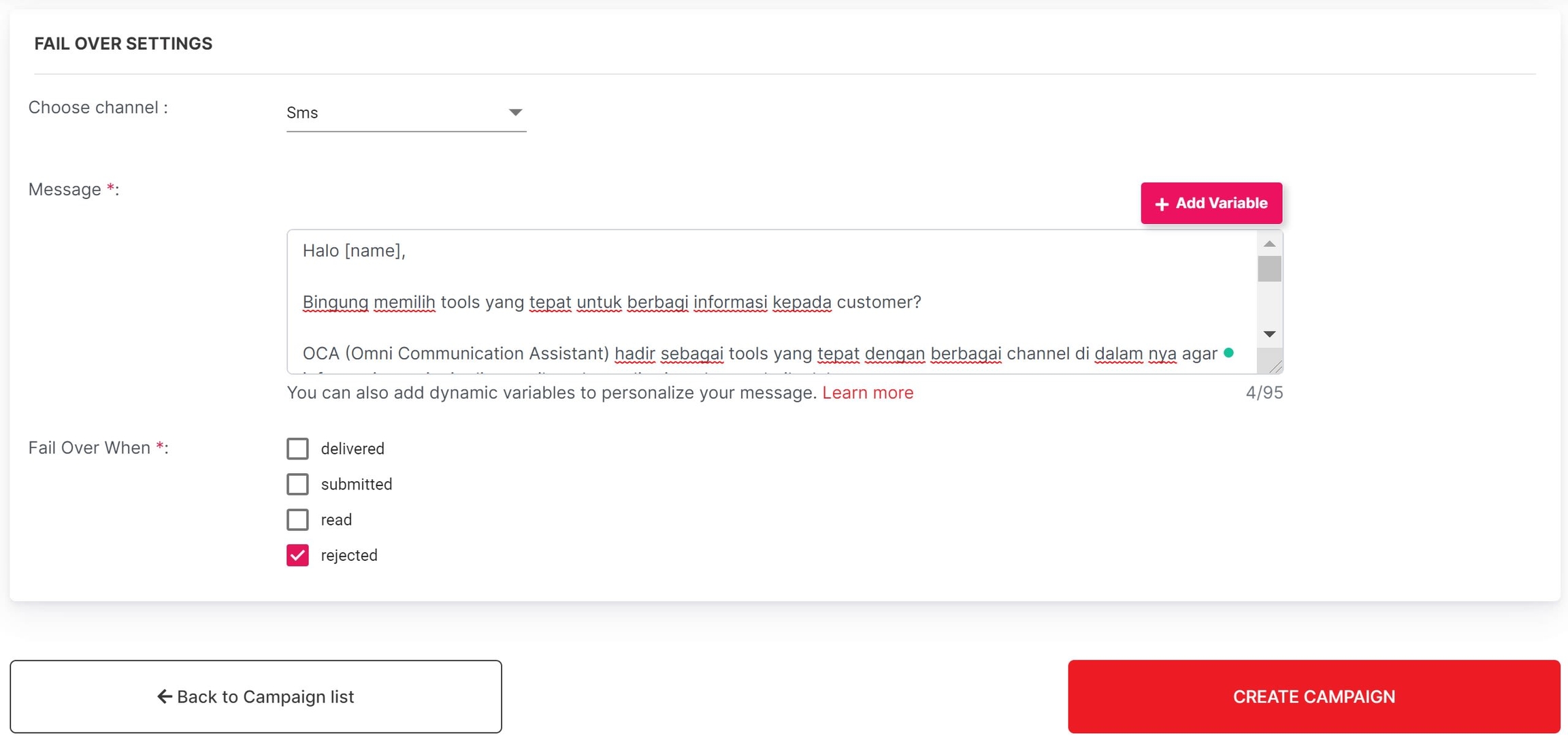 The WhatsApp feature includes failover facilities such as SMS, phone call, email, and ChatAja. In addition, the system can automatically send SMS or phone calls for certain statuses, such as delivered, submitted, read, and rejected. Below is an example of WhatsApp failover using SMS for those whose WhatsApp reception status is rejected.