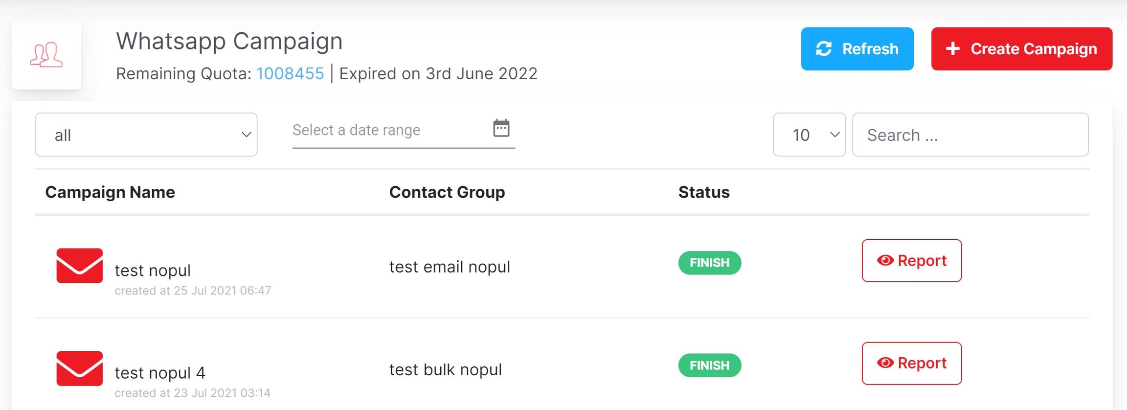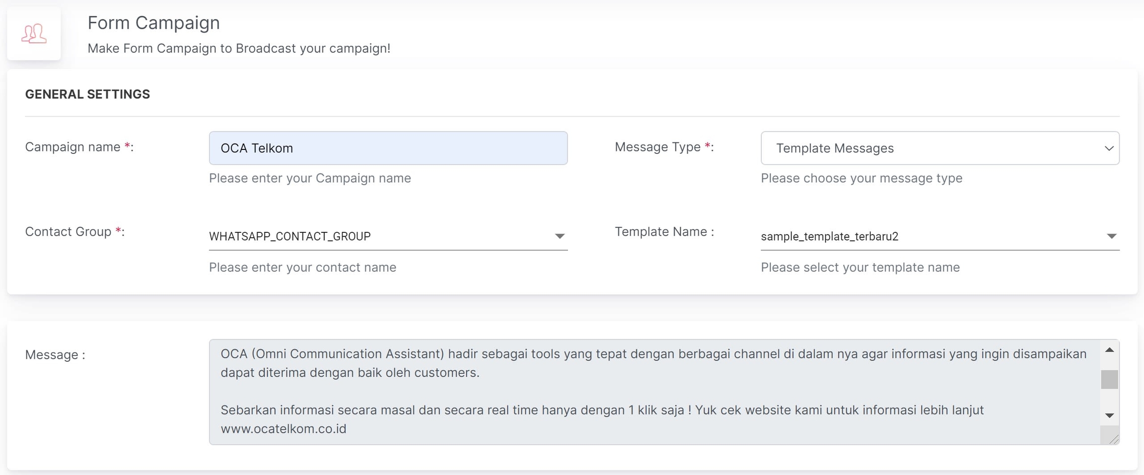 Before sending a WhatsApp Broadcast, ensure you have already created a contact group to which you will broadcast. In addition, you are required to register your message template on your Facebook Business platform beforehand so that WhatsApp Business can review it. Finally, please note that content that can be delivered through WhatsApp Business should be informational and not promotional. To initiate a new WhatsApp broadcast, select the +Create Campaign button on the top right side of the page top right side.