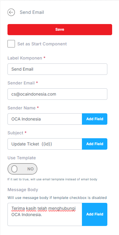 Anda pun dapat mengirimkan email kepada pelanggan secara otomatis setelah panggilan selesai melalui komponen Send Email.&#x20;