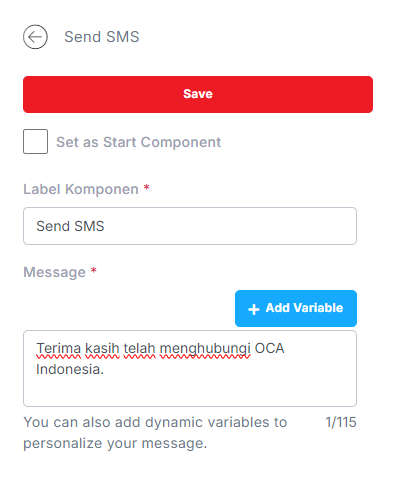 Jika Anda ingin memberikan informasi dalam bentuk SMS setelah panggilan diselesaikan, gunakan komponen Send SMS.