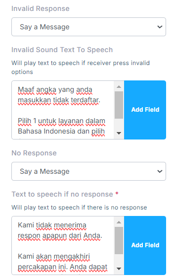 Sementara itu, jika pelanggan tidak memberikan respon sama sekali, Anda dapat menambahkan atau membuat pesan yang memberitahukan pelanggan bahwa tidak ada respon yang diterima pada bagian **No Response**.
