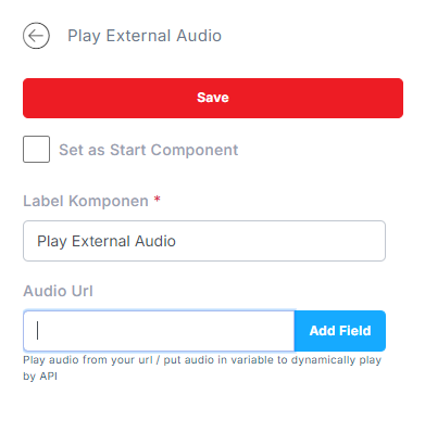 Komponen ini digunakan jika Anda akan memutar sebuah rekaman audio pada IVR. Komponen Play External Audio dapat diletakkan di awal, tengah, maupun akhir dari percakapan IVR.&#x20;