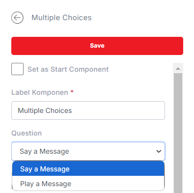 Gunakan komponen Multiple Choice jika Anda ingin memberikan beberapa pilihan kepada pelanggan saat berinteraksi dengan IVR. Tambahkan pesan kepada pelanggan dalam komponen ini pada pilihan **Question**. Pilih **Say a Message** jika Anda ingin menggunakan fitur *text-to-voice* saat menyampaikan pesan kepada pelanggan, atau pilih **Play a Message** jika Anda ingin menggunakan rekaman audio.