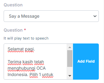 You can add a dynamic contect related to your customer information to make the IVR conversation more personal by selecting **Add Field**. As an example, you can add a variable of name, email, phone number, or other data.