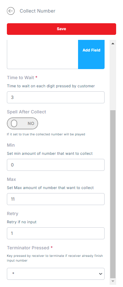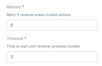 Anda dapat menentukan jumlah minimal dan maksimal digit yang dapat dimasukkan oleh pelanggan pada bagian **Min** dan **Max**. Jika IVR tidak menerima respon apapun, Anda dapat menentukan berapa kali maksimal percobaan ulang yang dapat dilakukan oleh pelanggan pada bagian **Retry**.