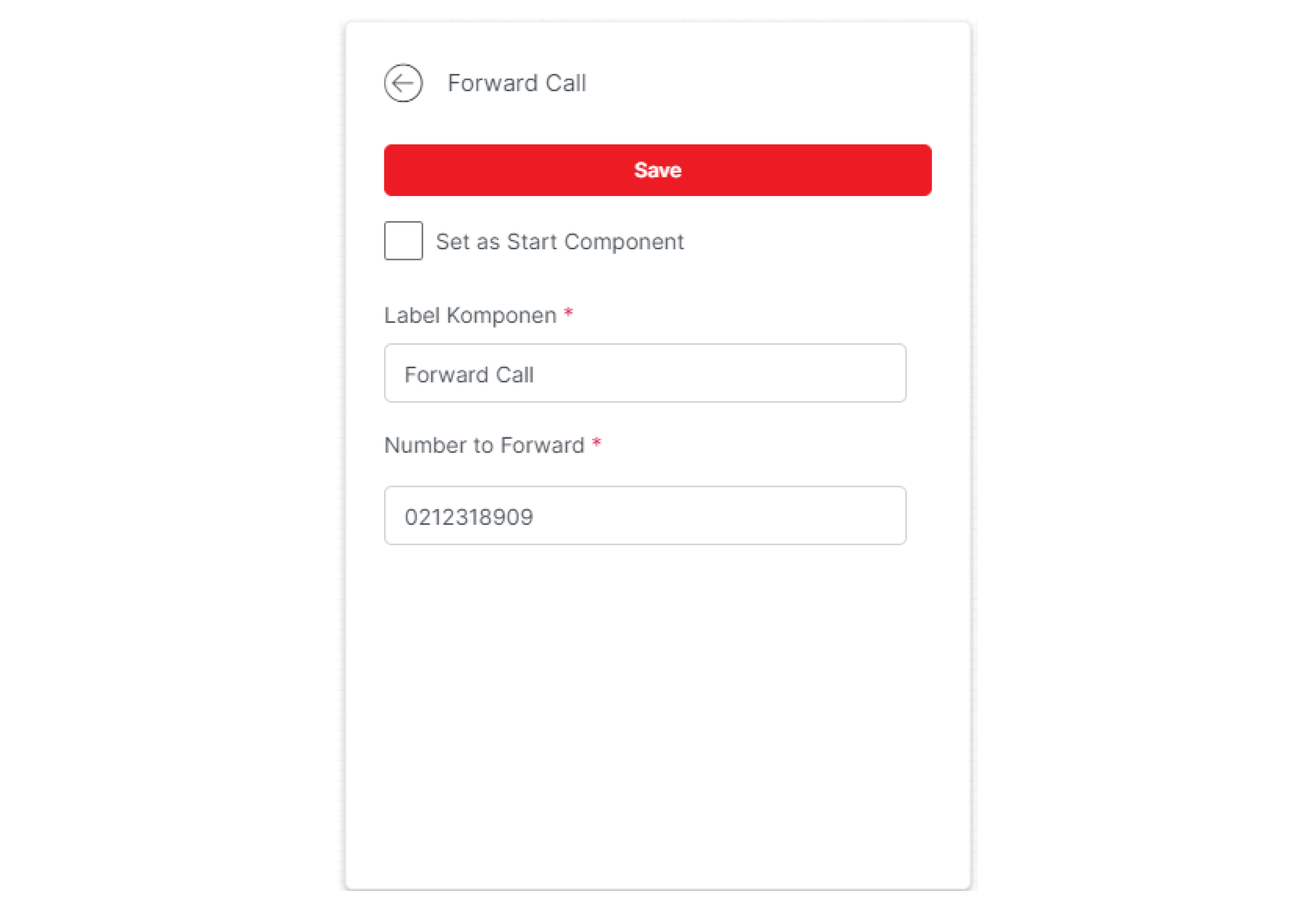 Komponen Forward Call dapat digunakan jika Anda ingin meneruskan panggilan IVR ke nomor telpon lainnya, misalnya ke nomor telpon Live Agent. Masukkan nomor yang dituju pada **Number to Forward**.