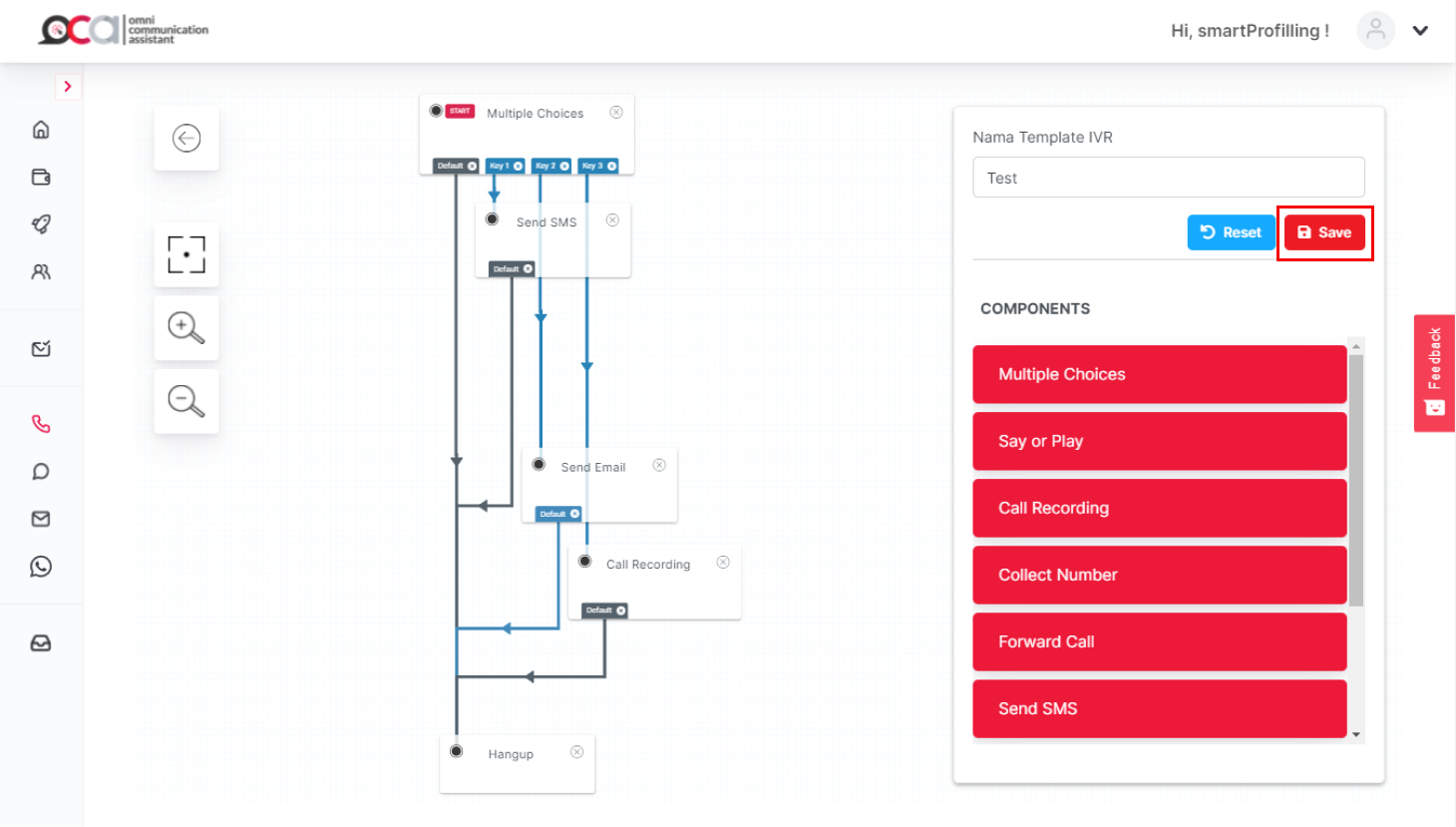 Klik **Save** pada bagian kanan atas saat Anda telah selesai membuat alur percakapan IVR.