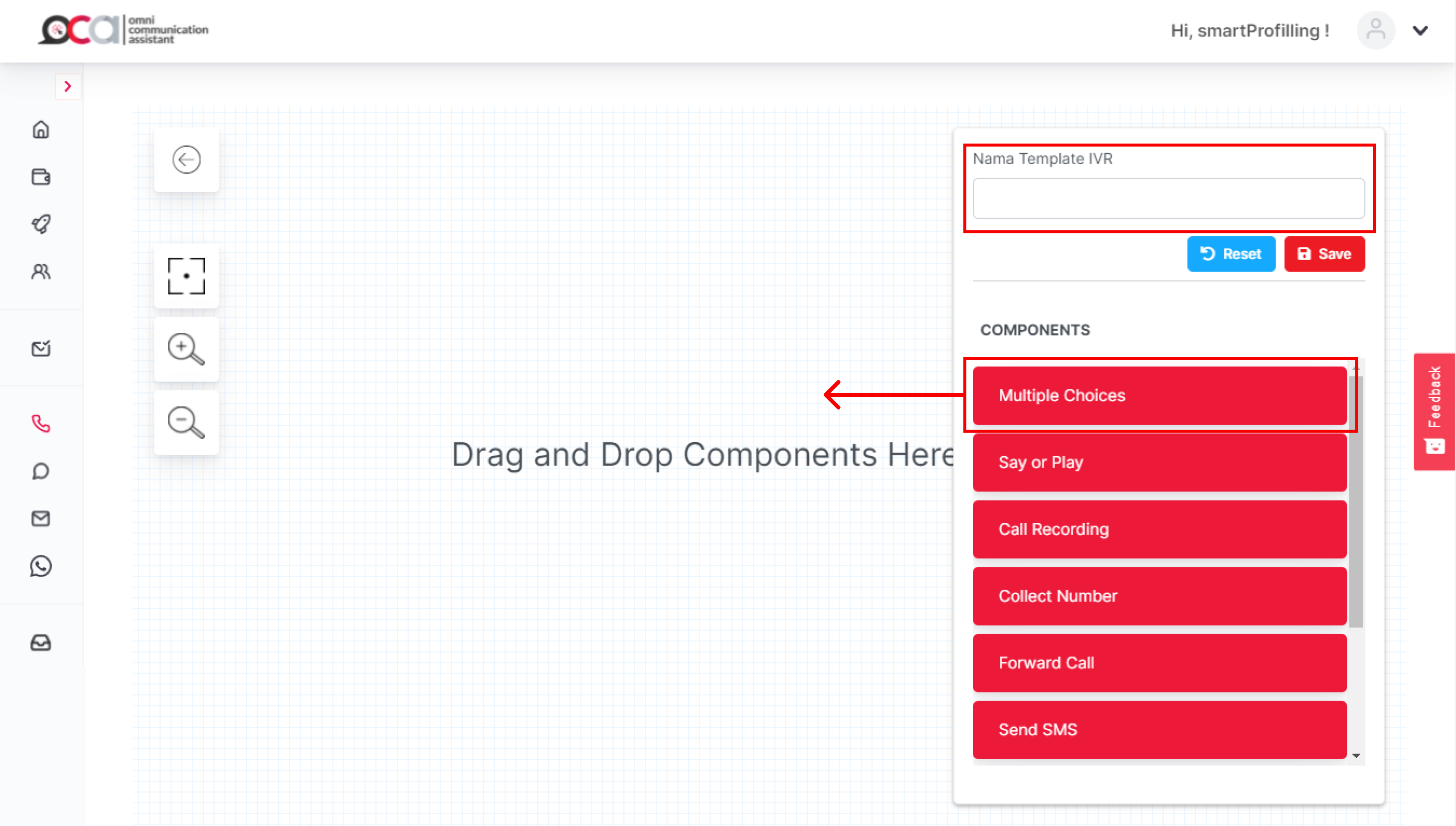 Masukkan nama IVR yang akan Anda buat, kemudian tarik dan lepaskan salah satu komponen yang ingin ditambahkan ke dalam IVR board.&#x20;