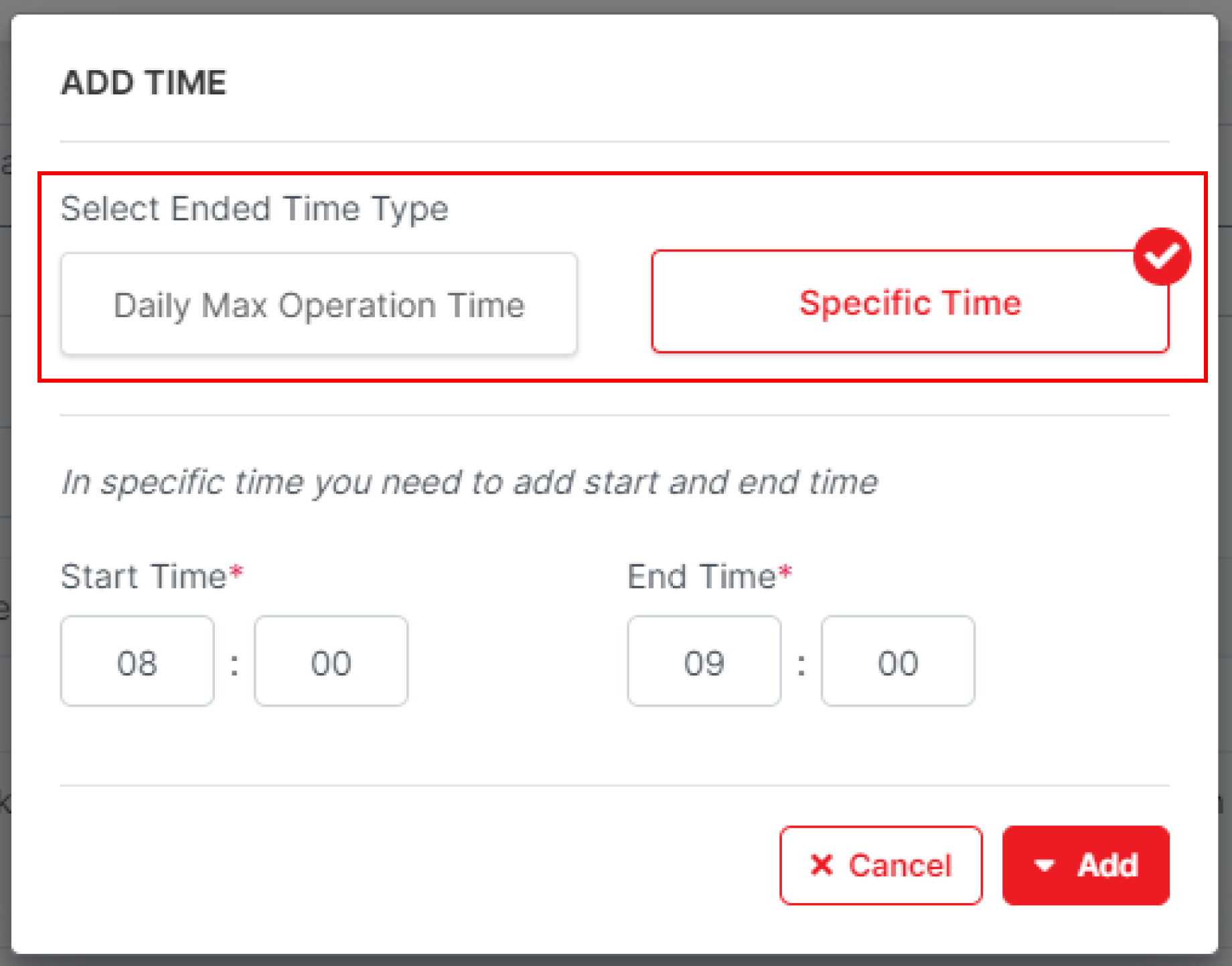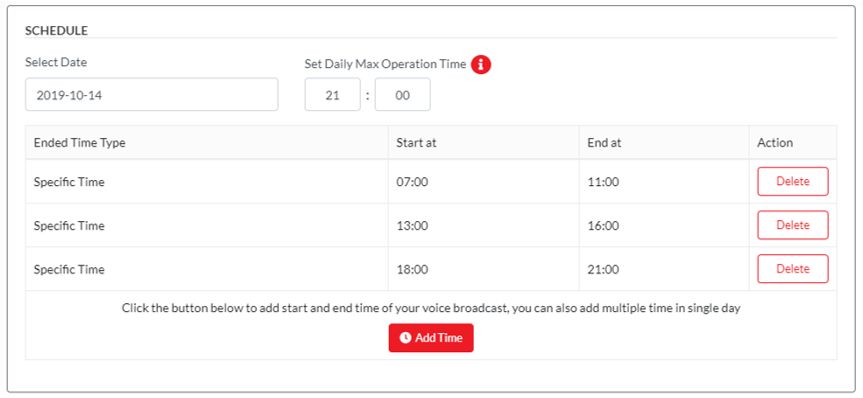 Pada bagian Schedule, pilih waktu broadcast pada kolom Select Date dan atur waktu berakhirnya pengoperasian broadcast pada kolom Set Daily Max Operation Time. Kemudian, klik tombol Add Time untuk mengatur waktu mulai dari running call.