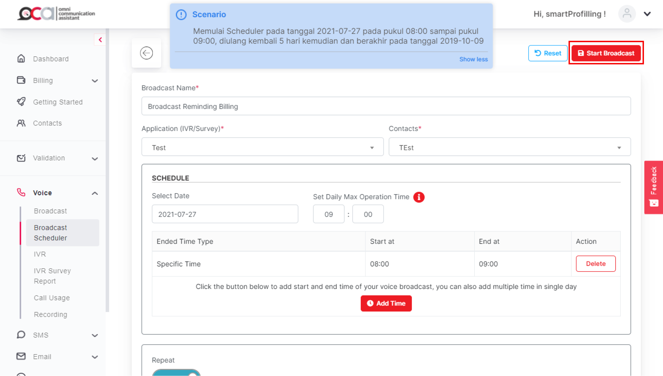 Jika dalam satu hari terdapat beberapa kali watu iterasi yang berbeda-beda, Anda dapat memilih Specific Time untuk melakukan penjadwalan broadcast.