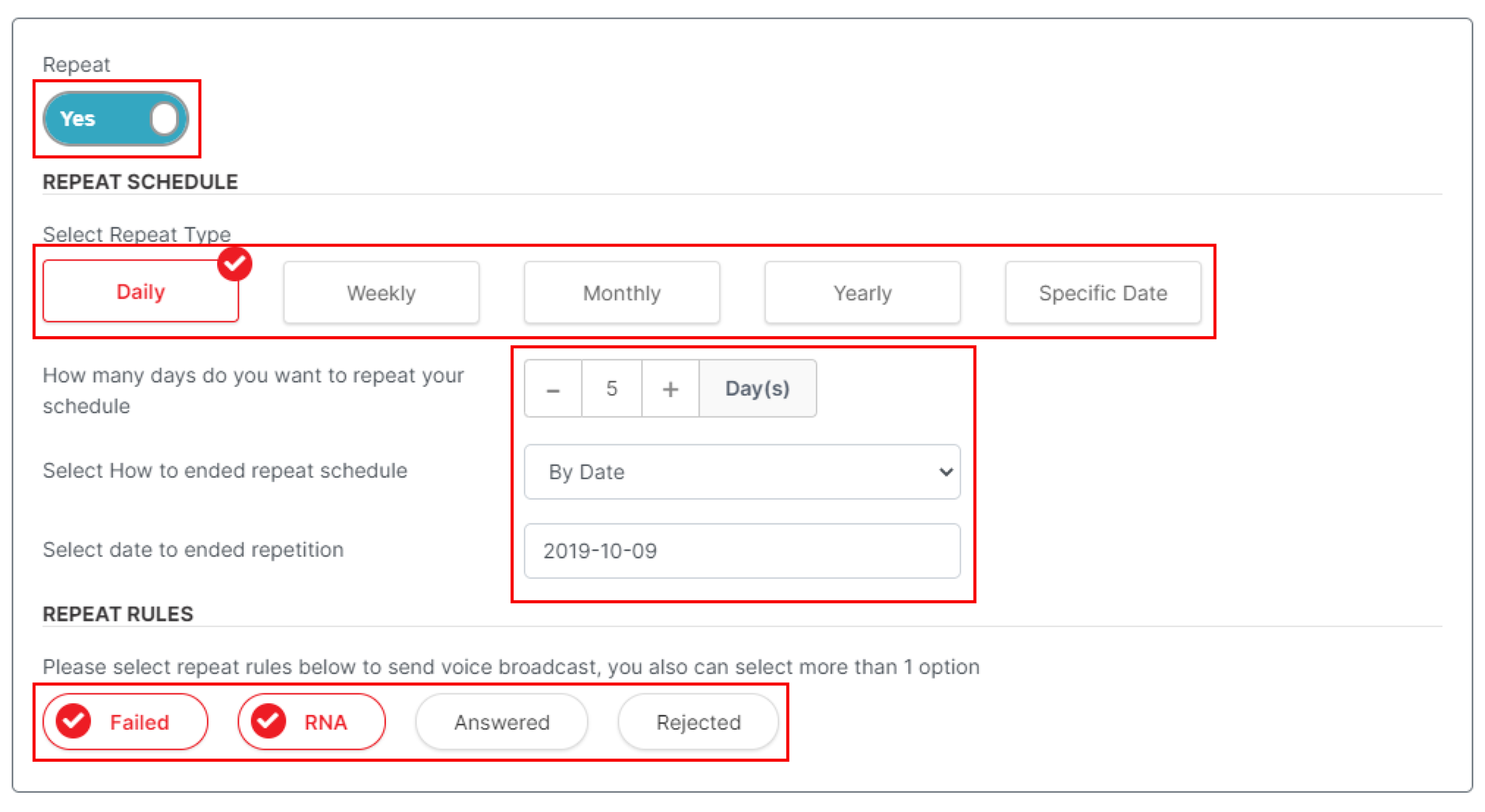 Di bawah ini merupakan contoh pengaturan untuk pengulangan penjadwalan. Anda juga dapat menentukan frekuensi pengulangan dan tanggal berakhirnya repetisi. Selain itu, broadcast yang diulang juga bisa diatur apakah hanya broadcast yang failed saja, atau semua.