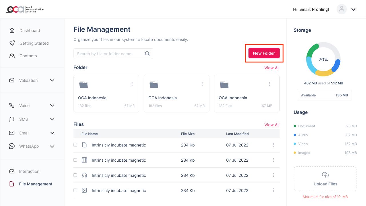 Setelah mengunggah beberapa file yang dibutuhkan, Anda juga bisa mengkategorisasikan file-file Anda, ke dalam satu folder. Caranya-pun cukup mudah, Anda hanya perlu menekan tombol ***New Folder*** di dalam laman File Management. Kemudian, Anda akan membuat satu folder baru, dan Anda bisa menamai folder tersebut sesuai kebutuhan Anda.