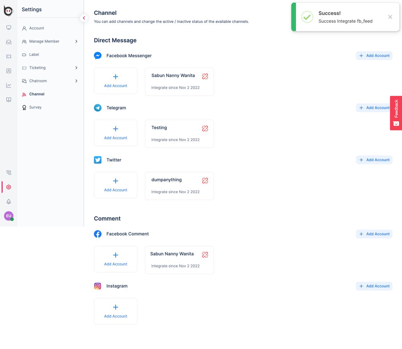 In addition to integrating channels in the Direct Message section, you can also integrate channels for comments. For example, Facebook comments can be integrated into OCA Interaction.