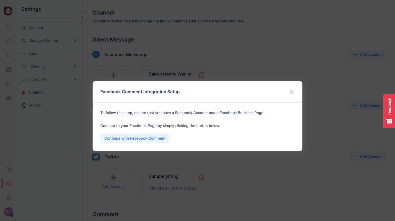 To do this, you can add your account directly to the Facebook Comment channel for integration. A Facebook Comment Integration Setup pop-up will appear, and you can immediately press the "Continue with Facebook Messenger" button.