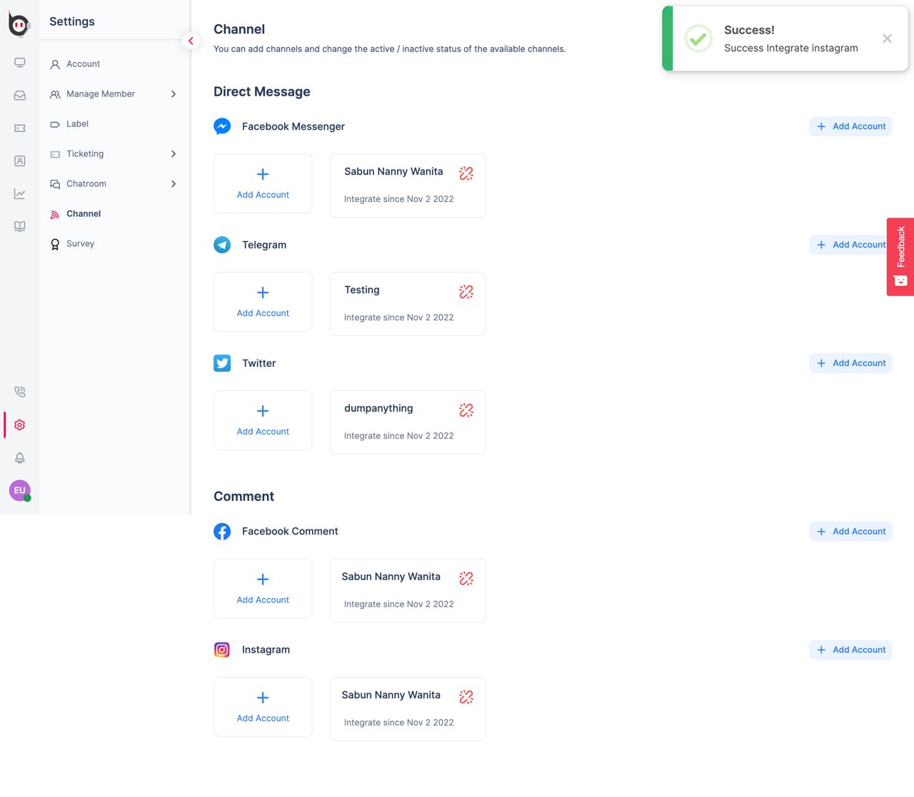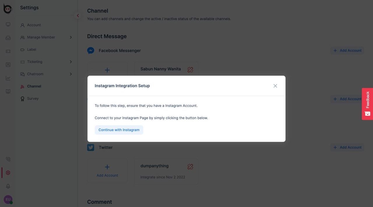 Finally, you can integrate Instagram Channels into OCA Interaction for Comments. Add your account to be integrated with the Instagram channel to do this. Then, a pop-up window called "Instagram Integration Setup" will appear. Press the "Continue with Instagram" button to proceed.