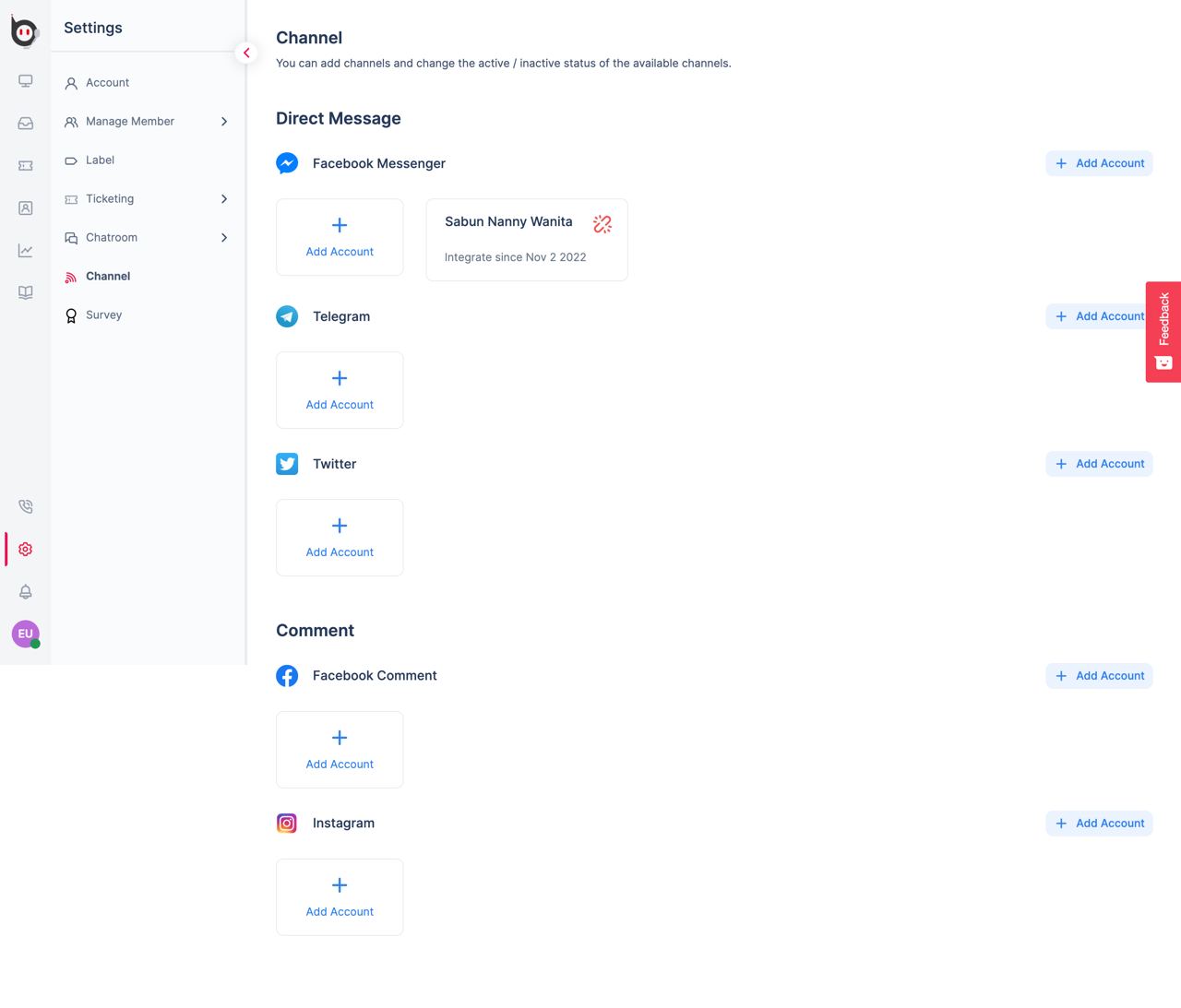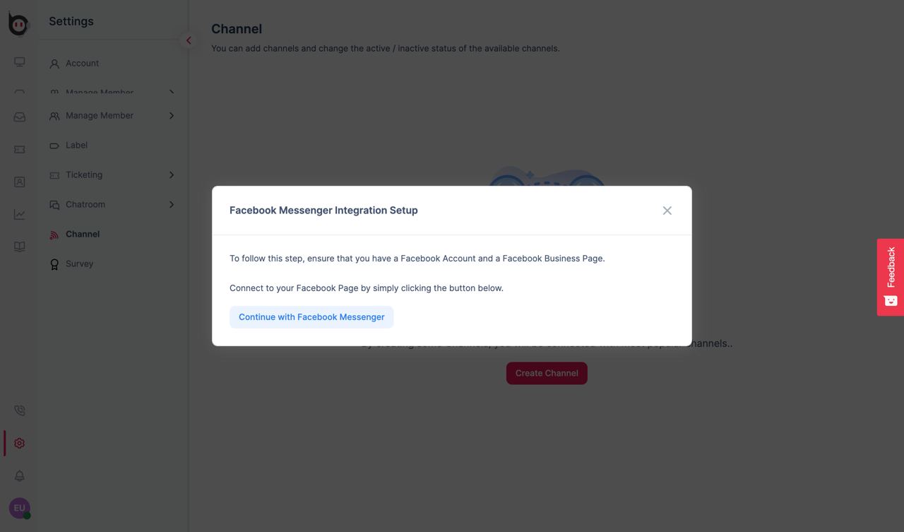 If you have already created a Direct Messages channel, you can connect it to several other messaging platforms, including Facebook Messenger. To integrate Facebook Messenger, add your account to the Messenger channel and click the "Continue with Facebook Messenger" button in the Facebook Integration Setup pop-up that appears.