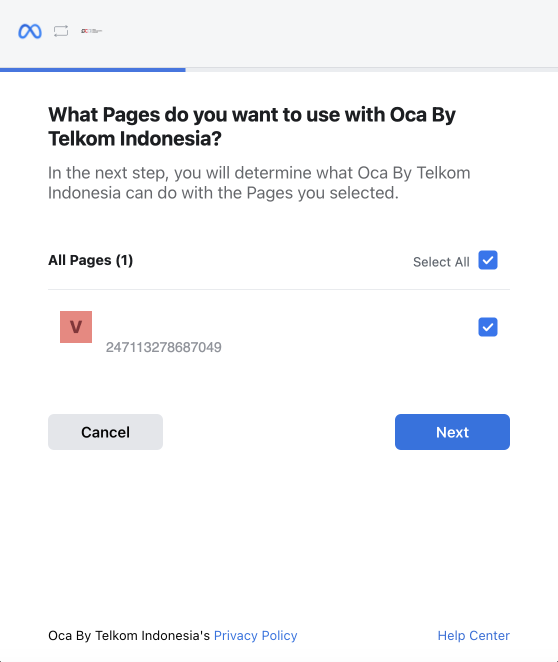 Afterward, a "Pages" pop-up will appear. Select the Facebook pages you want to integrate into OCA Interaction.