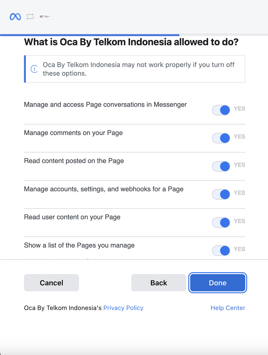 Then, grant the necessary permissions to integrate Facebook Messenger into OCA Interaction.