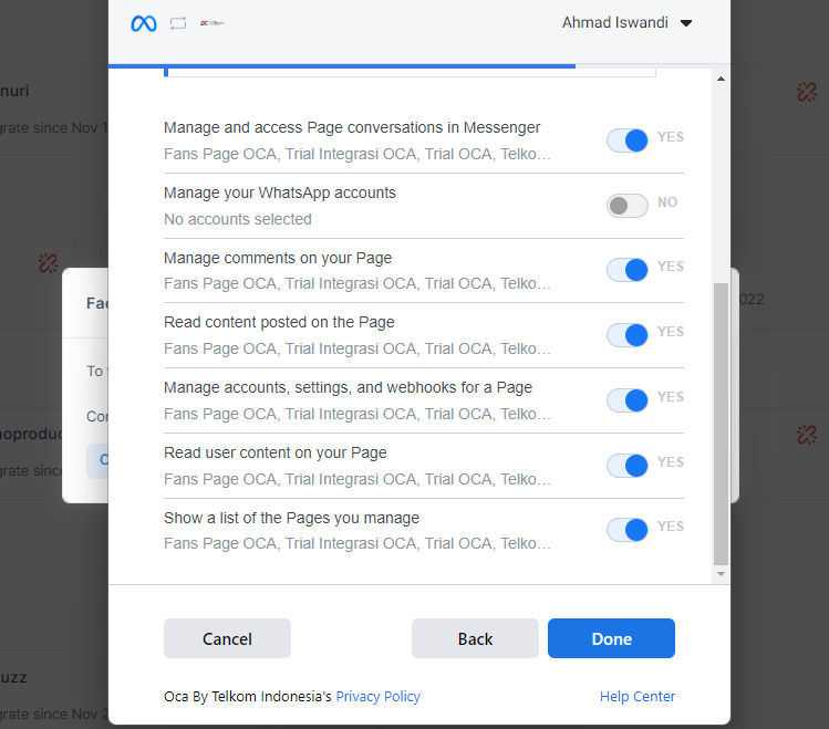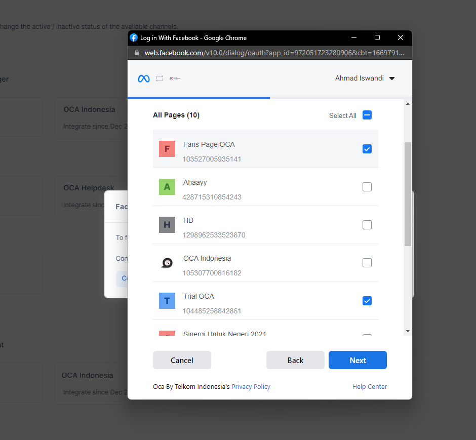 Then return to the DashboardInteraction, where a Facebook Integration Setup pop-up will appear. You can immediately press the Continue with Facebook Messenger button and select the page that has been created.