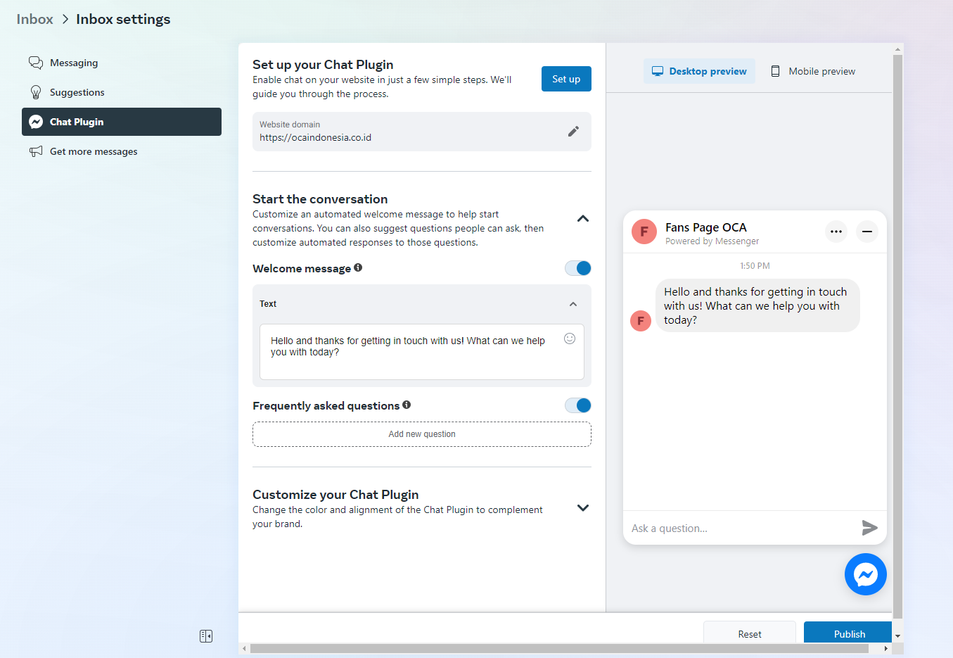 Afterward, configure Webchat by filling in the Language and Add Domains. Once everything is filled in, you can customize the appearance of Webchat and see a live preview.