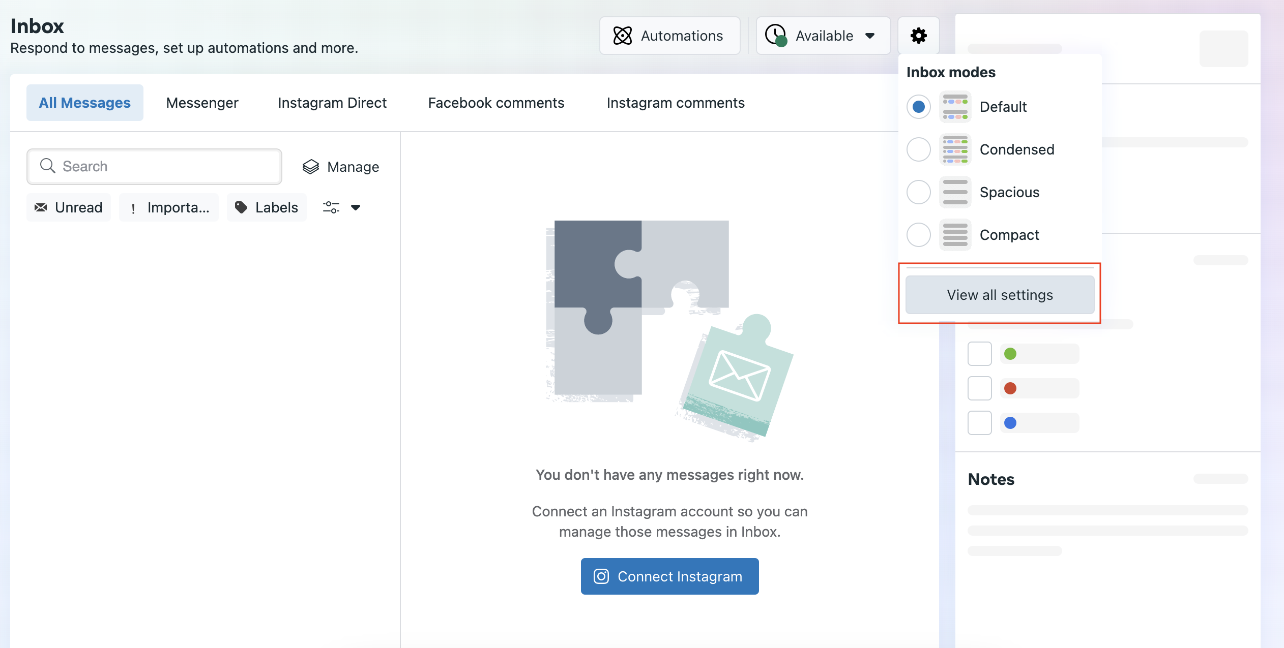 To integrate, go to the [Facebook Page](https://business.facebook.com/latest/home?nav_ref=bm_home_redirect\&asset_id=247113278687049), the Inbox tab, Settings, and View All Settings. Once in the Inbox Settings, select Set Up, and a pop-up setup method will appear. Select Standard.