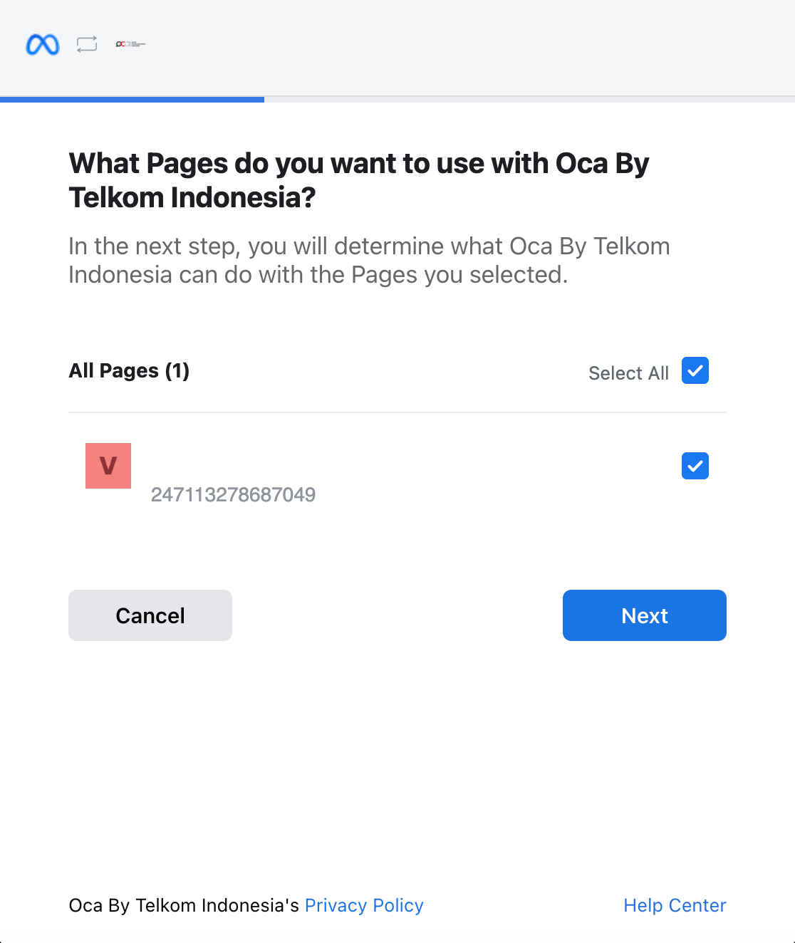 Selanjutnya akan muncul pop-up laman Pages yang akan Anda integrasikan ke dalam OCA Interaction. Anda bisa membuat dan memilih beberapa pages yang sebelumnya sudah Anda buat di Facebook Anda.