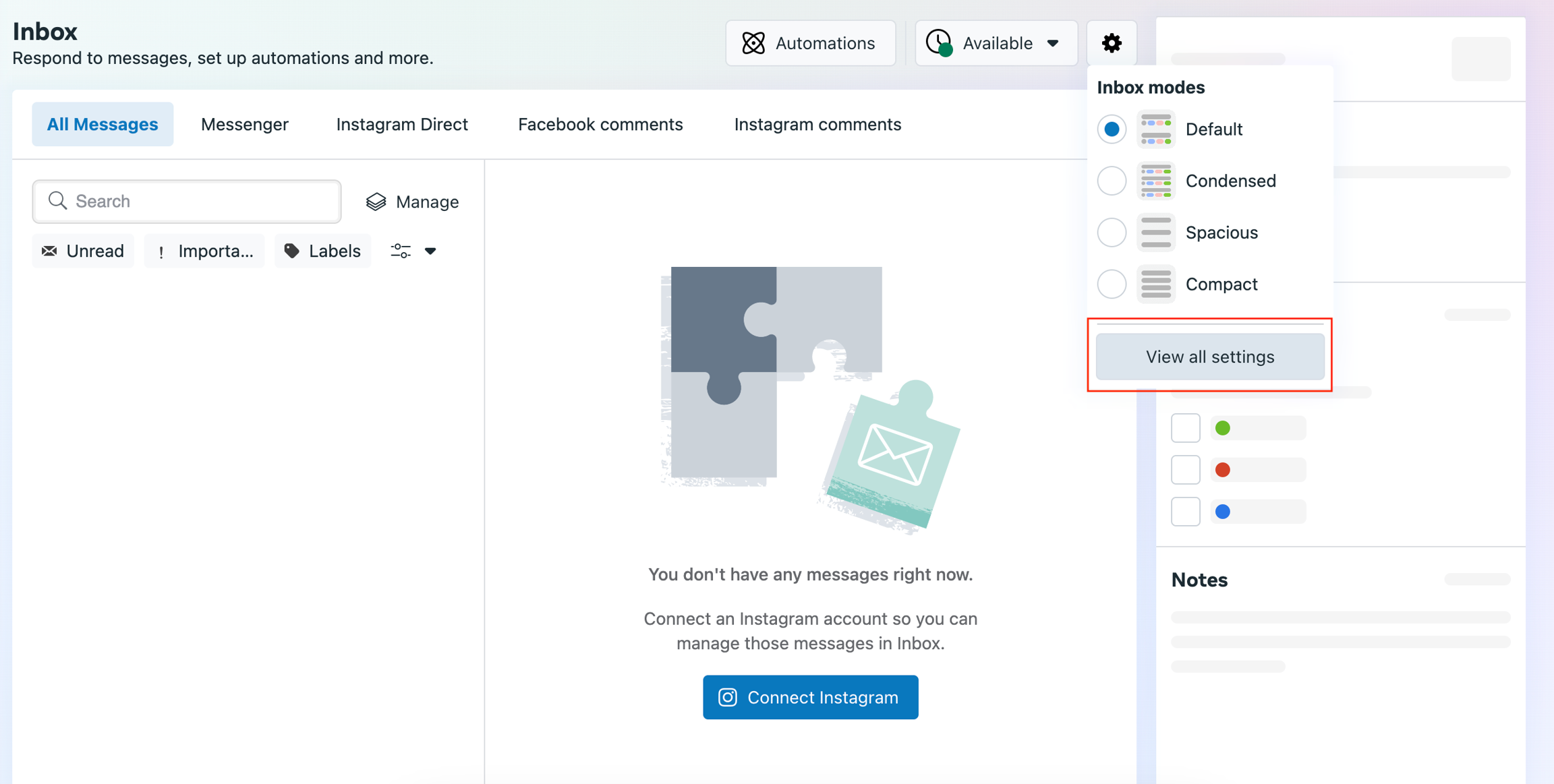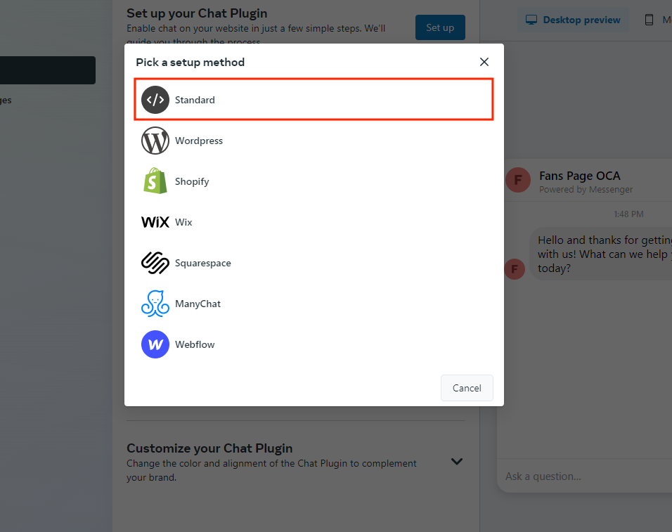 Untuk mengintegrasikannya, pergi ke laman Facebook Page, kemudian masuk ke laman tab Inbox, kemudian Settings dan View All Settings. Jika sudah memasuki Inbox Settings, silahkan pilih Set Up, dan kemudian akan muncul pop-up setup method, selanjutnya pilih Standard.