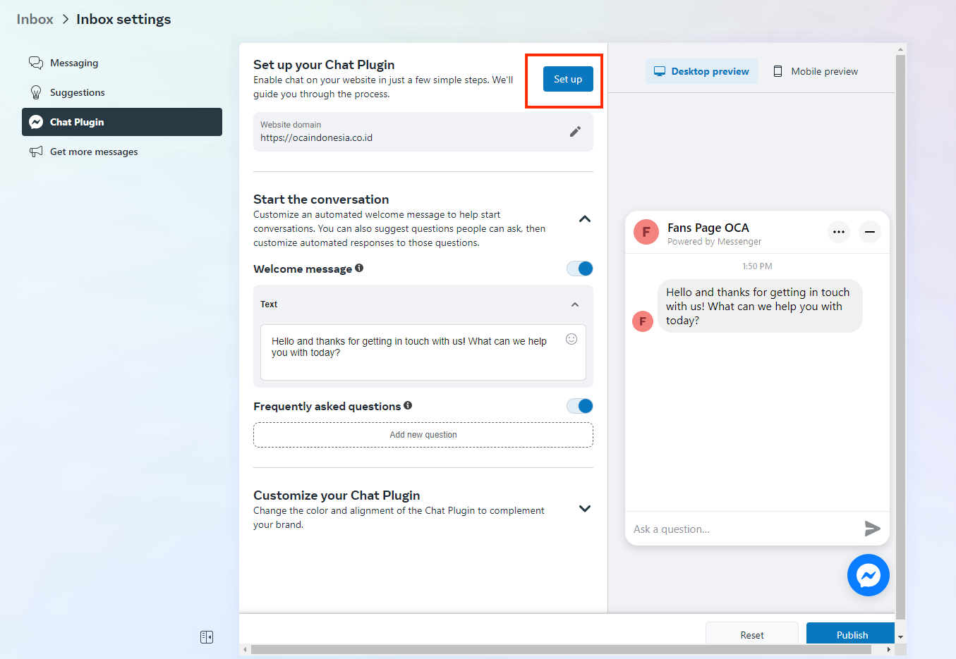 Jika sebelumnya Anda sudah membuat Channel untuk Direct Message, dan sudah terhubung dengan Facebook Messenger, di dalamnya juga Anda bisa mengintegrasikan dengan Webchat Widget yang dapat digunakan melalui FBM.