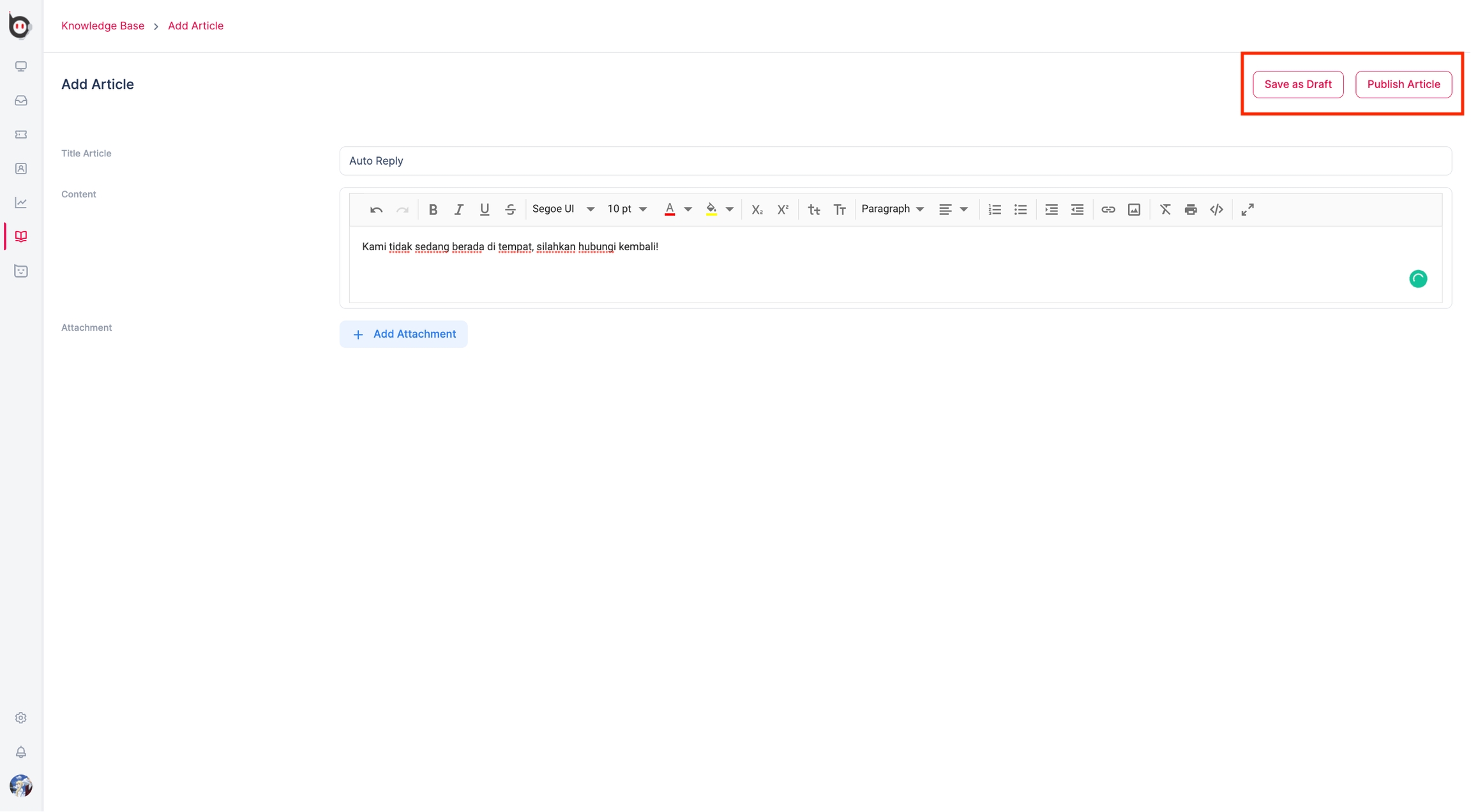 Sekarang, Anda sudah memiliki kategori, beserta isi artikel yang akan Anda publikasikan ke dalam Knowledge-base. Anda bisa menyimpannya sebagai draft dengan menekan Save as Draft, atau bisa langsung mempublikasikannya dengan cara menekan Publish Article.